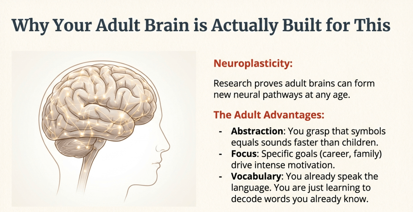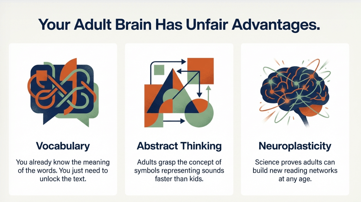 Research shows that adult brains retain neuroplasticity—the ability to form new neural pathways. You can absolutely create the reading networks in your brain that were never properly formed in childhood.