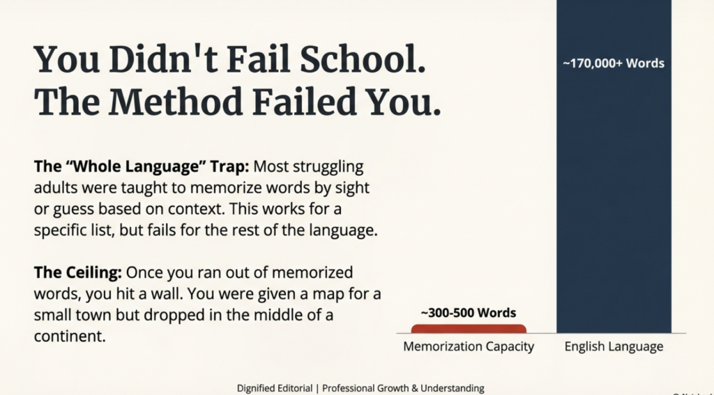 The critical point: The teaching method failed you. You didn’t fail. Your brain is perfectly capable of learning to read—it just needs the right instruction.