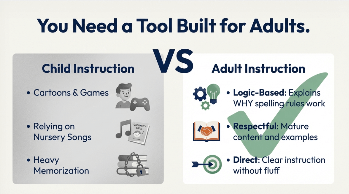 Understanding the ‘why’ behind spelling. Adults want to understand why English spelling works the way it does. Quality instruction explains the logic behind spelling patterns, not just memorizing exceptions.