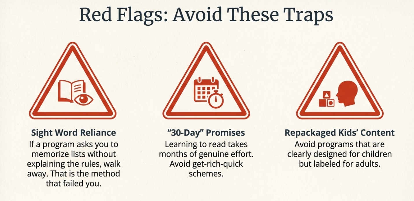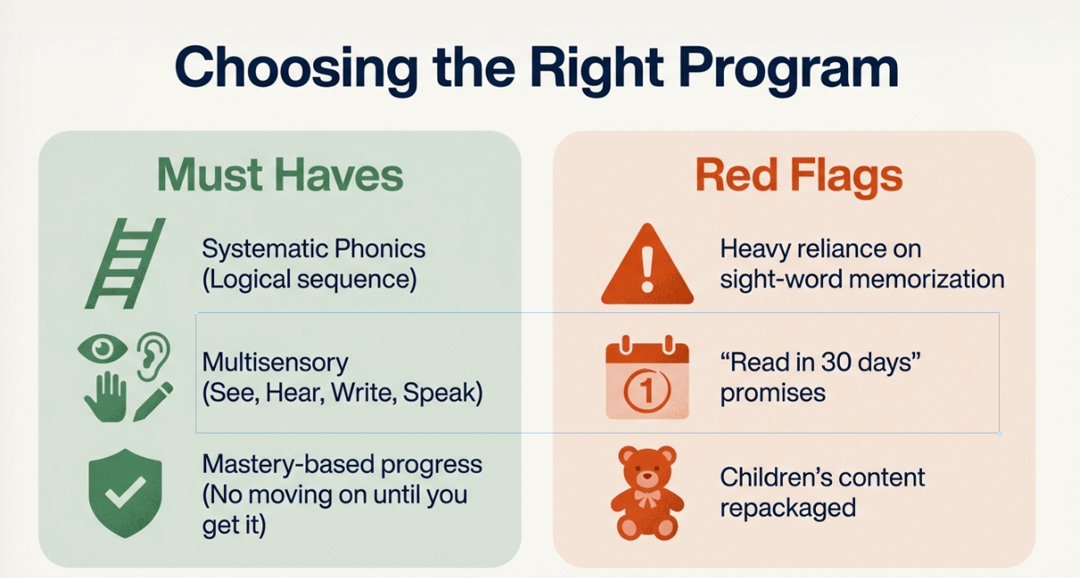 Heavy reliance on sight word memorization. If a program emphasizes memorizing long lists of words without teaching you how to decode them, it’s using the method that likely failed you in childhood.