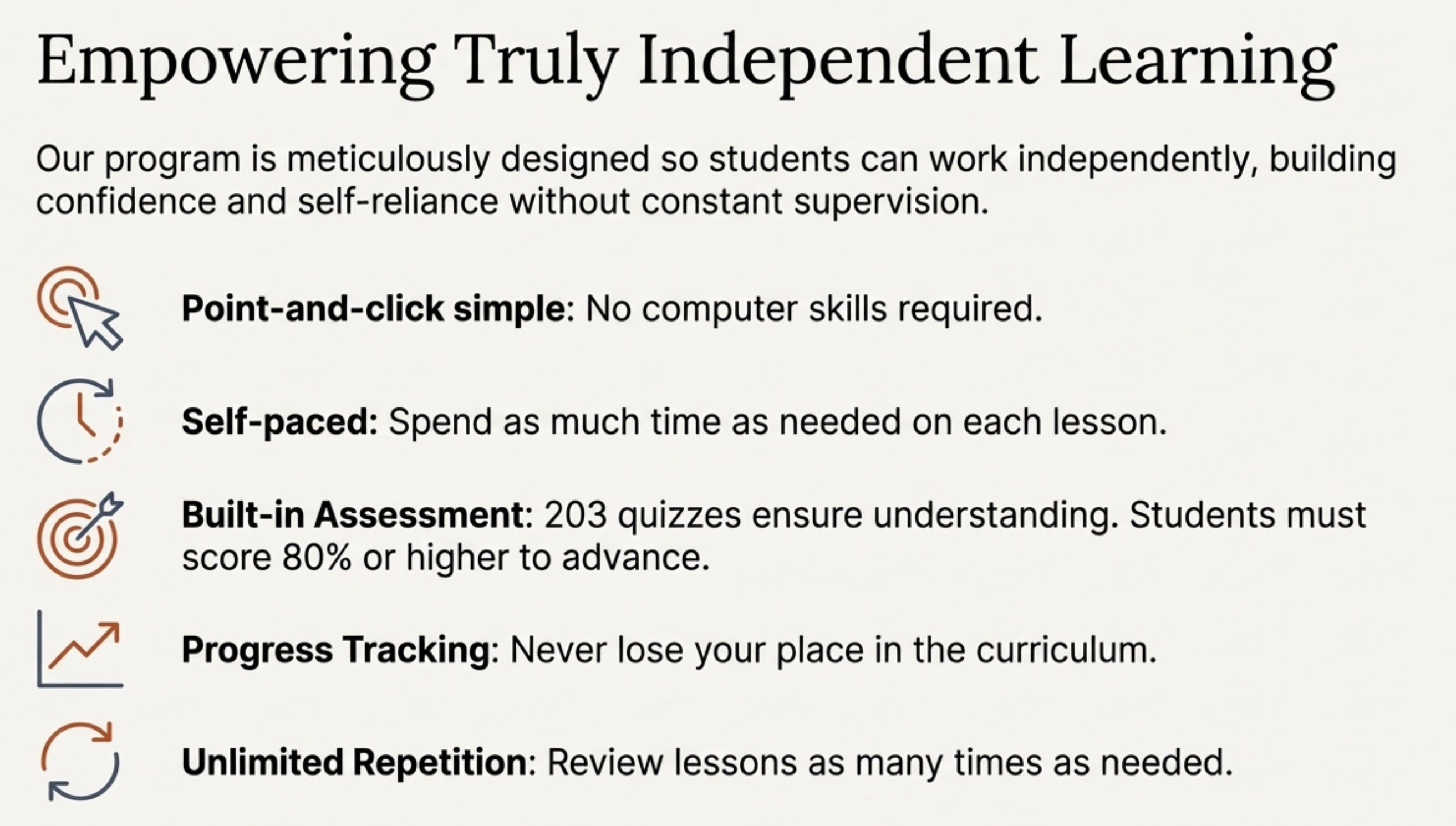 - Self-paced – Spend as much time as needed on each lesson