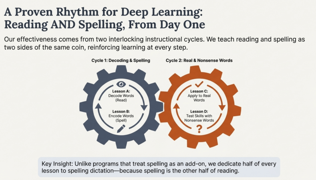 Unlike programs that treat spelling as an add-on, our curriculum teaches spelling systematically alongside phonics. Half of every lesson is dedicated to spelling dictation—because spelling is the other half of reading.