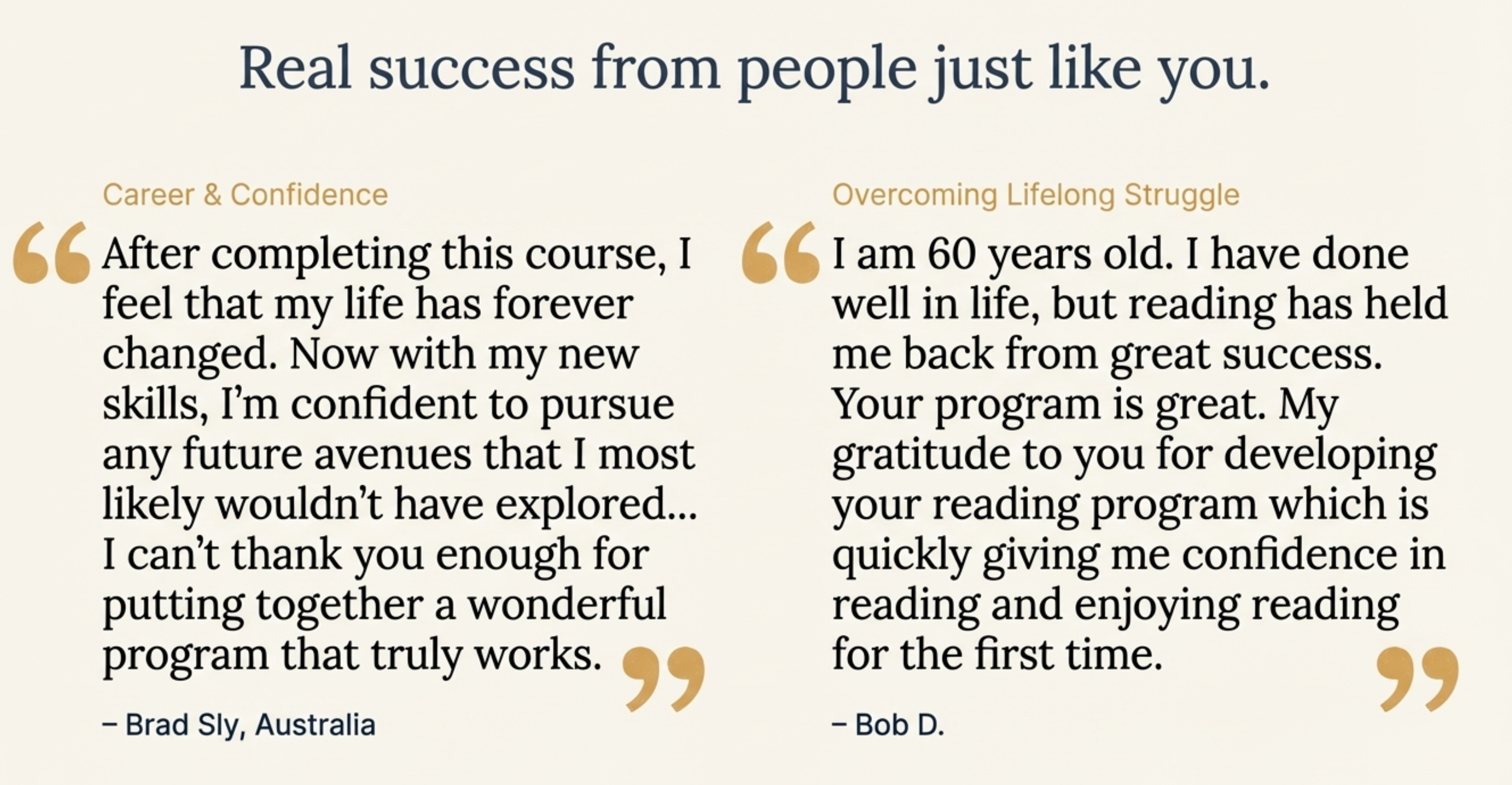 I wish I was introduced to your program when I was in grammar school. I am 60 years old and dyslexic… Your program is great and is quickly giving me confidence in reading for the first time.– Robert, Age 60