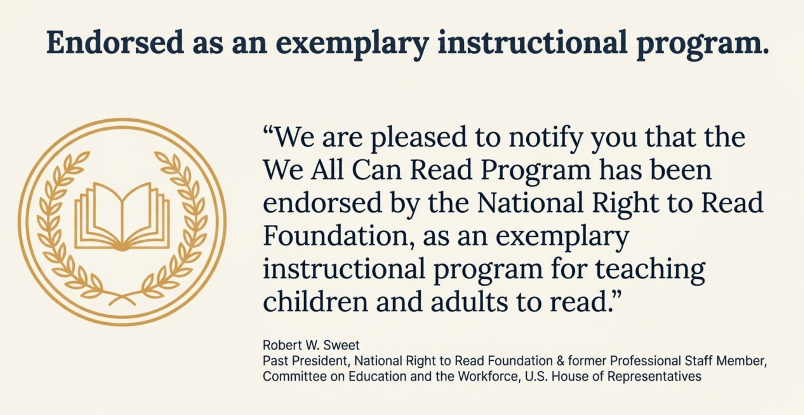 We are pleased to notify you that the We All Can Read Program has been endorsed by the National Right to Read Foundation, as an exemplary instructional program for teaching children and adults to read. / Robert W. Sweet – Past President of National Right to Read Foundation / former Professional Staff Member of the Committee on Education and the Workforce, U.S. House of Representatives