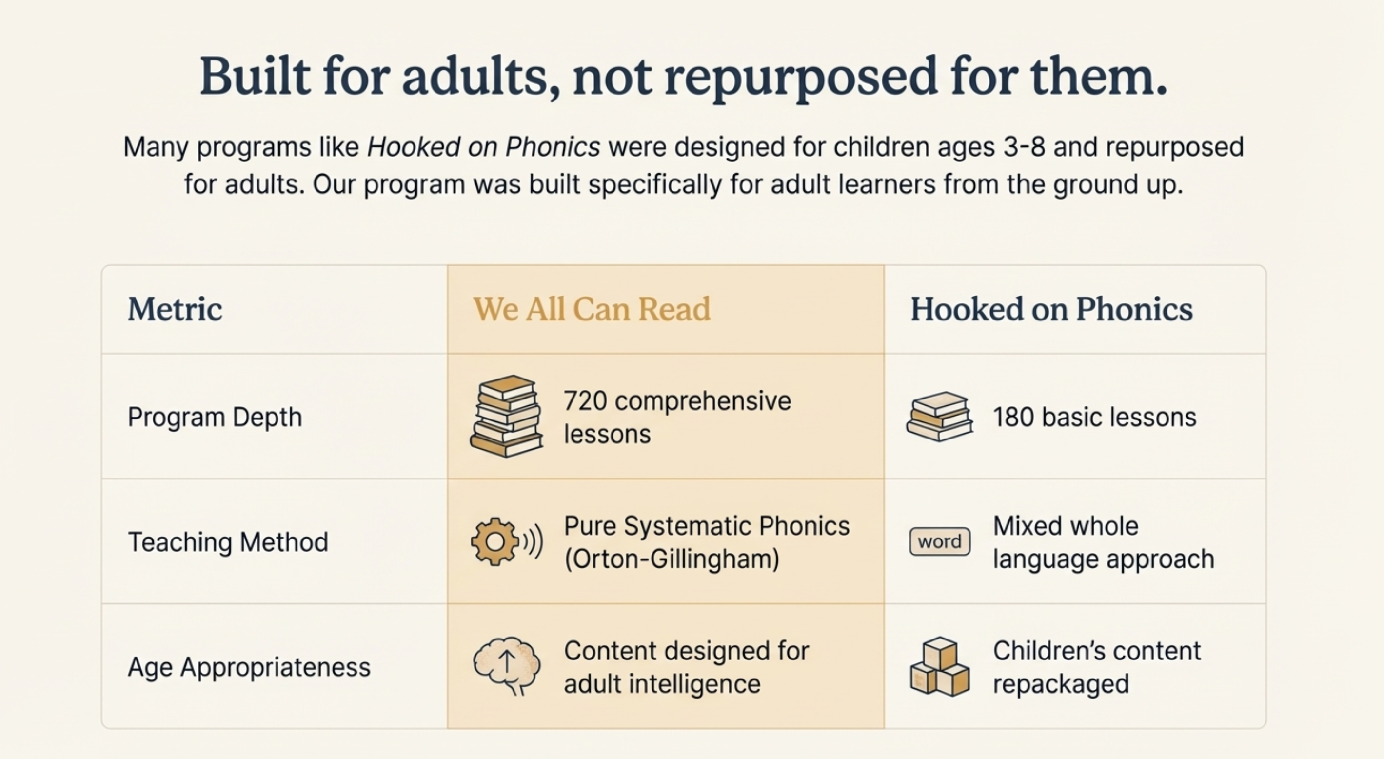 Many adults ask how we compare to programs like Hooked on Phonics, which markets itself as an adult reading solution. The key difference: Hooked on Phonics was designed for children ages 3-8 and repurposed for adults, while our program was built specifically for adult learners from the ground up using proven Orton-Gillingham methods.