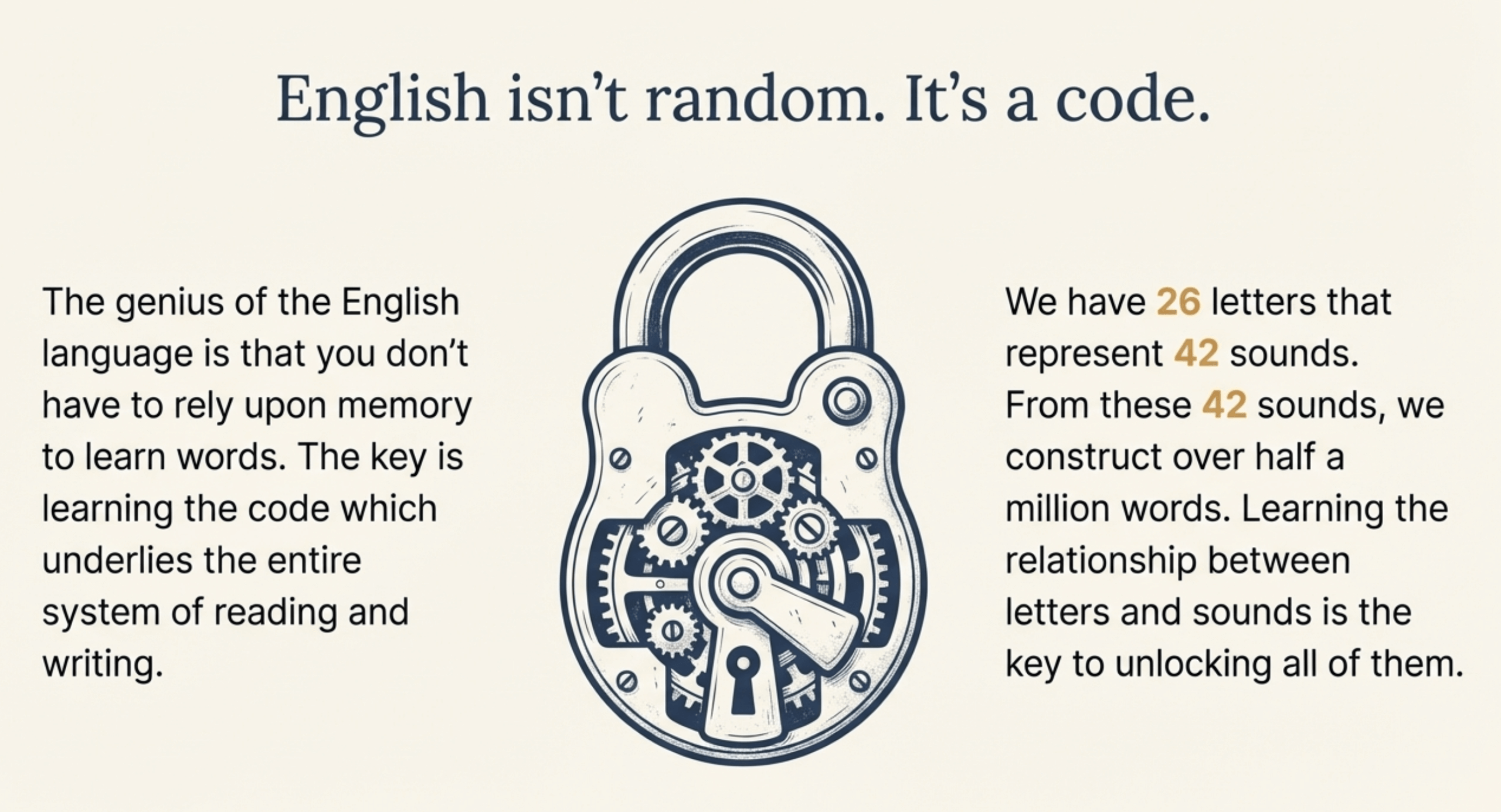 Now when I talk about phonics, I am talking about the fact that there is a direct and consistent relationship between letters and sounds in our language. English is a phonetic language, not all languages are phonetic. As an example the Chinese language is nonphonetic. The characters in their language do not represent sounds. But in English we have 26 letters that represent 42 sounds. And from these 42 sounds we construct over a half-million words in vocabulary. English is the largest vocabulary of any language in the world. And we write all of these over half-million words with just 26 letters. The key to becoming a good reader and a good speller is to learn the relationship of letters and sounds in our language. And that is what systematic, intensive phonics is designed to do – to teach you the code which underlies the entire system of reading and writing in our English language.
