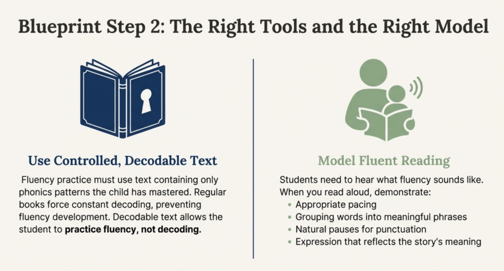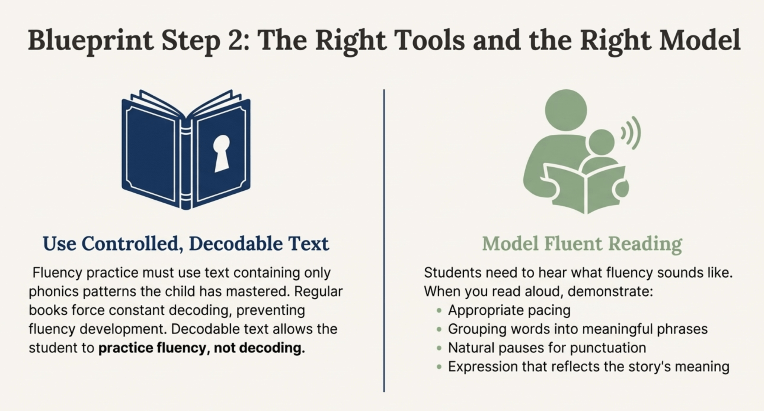 Fluency practice must use text containing only phonics patterns your child has mastered. Regular books contain too many unknown patterns, forcing constant decoding effort that prevents fluency development.