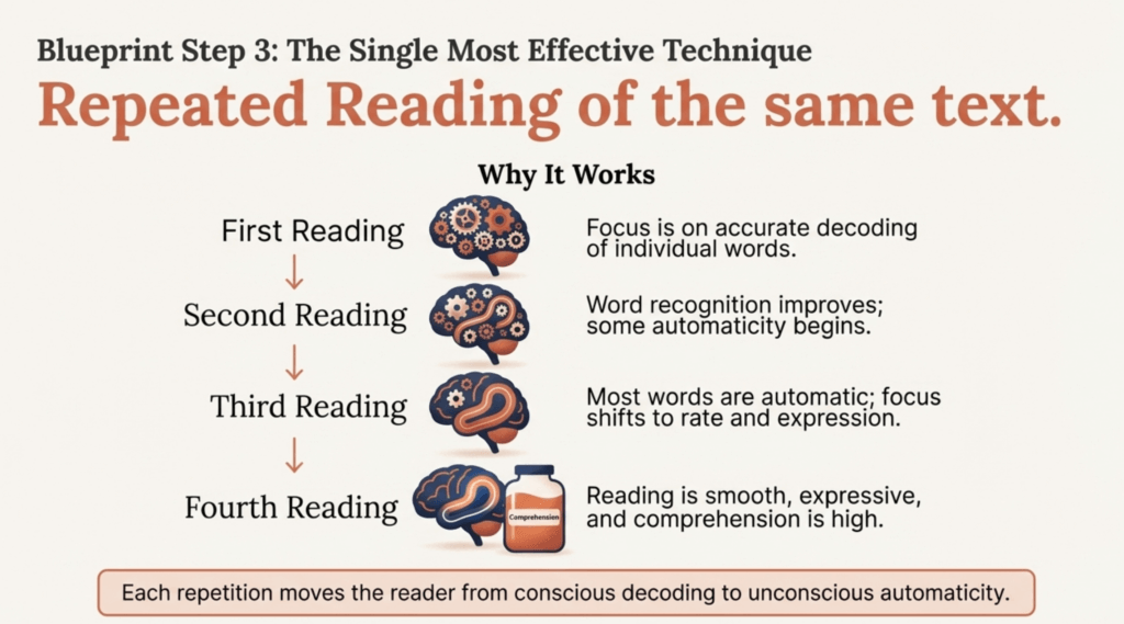 Research consistently shows that students who reread passages multiple times develop significantly better fluency than students who read different passages once.