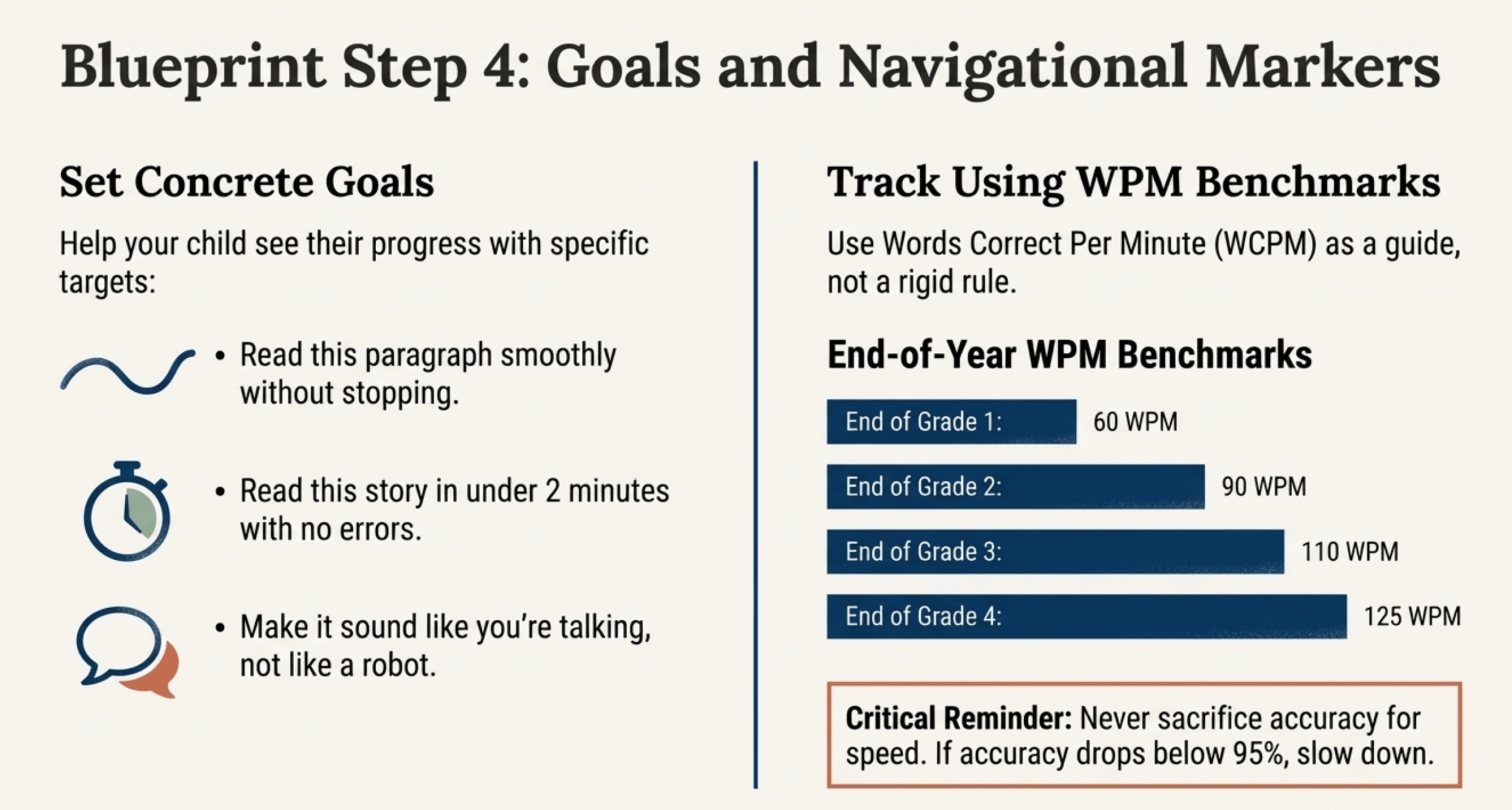 Maintain the 95% accuracy standard: If reading rate is increasing but accuracy is dropping below 95%, slow down. Fluency built on inaccurate reading creates bad habits that are difficult to break.