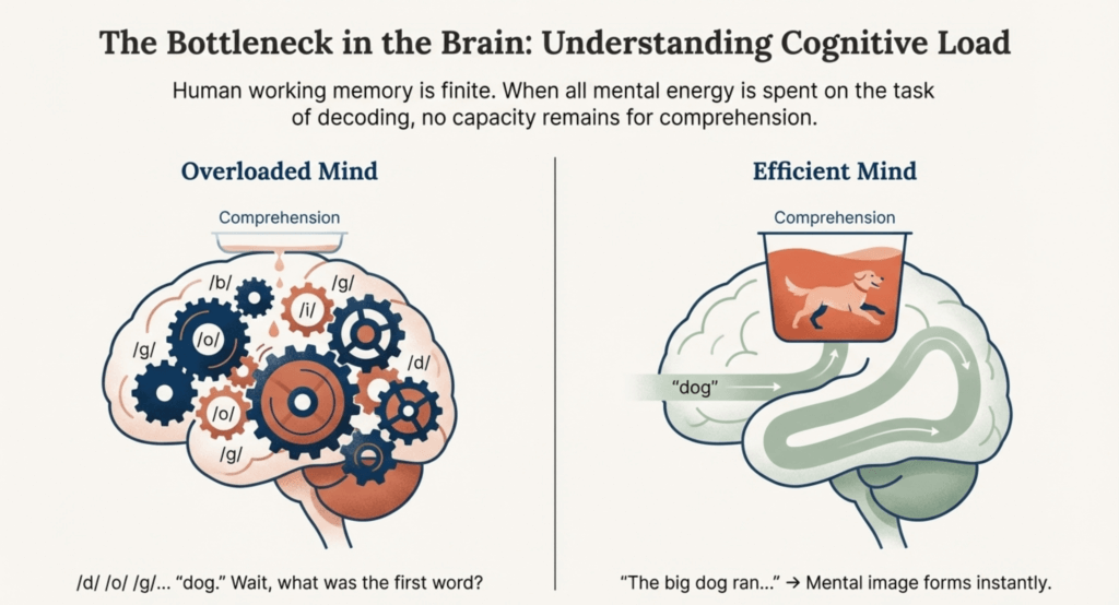 By the time the student finishes decoding “ran,” they’ve forgotten “the big dog.” They must reread the sentence, spending mental energy on decoding rather than meaning.