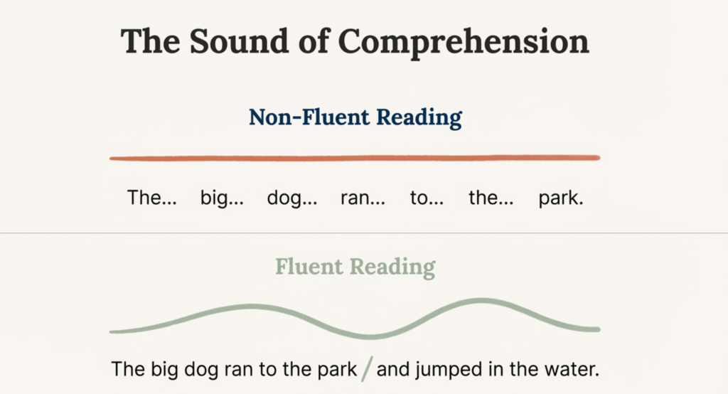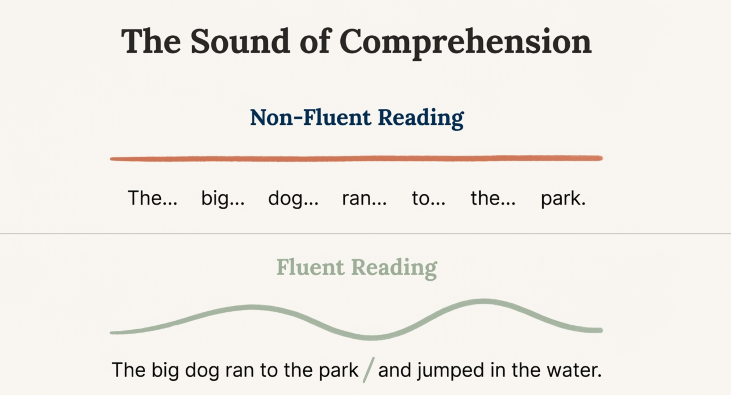 The fluent reader groups words into meaningful phrases, pauses naturally at phrase boundaries, adjusts intonation to reflect punctuation, and reads at a pace that sounds like natural speech.