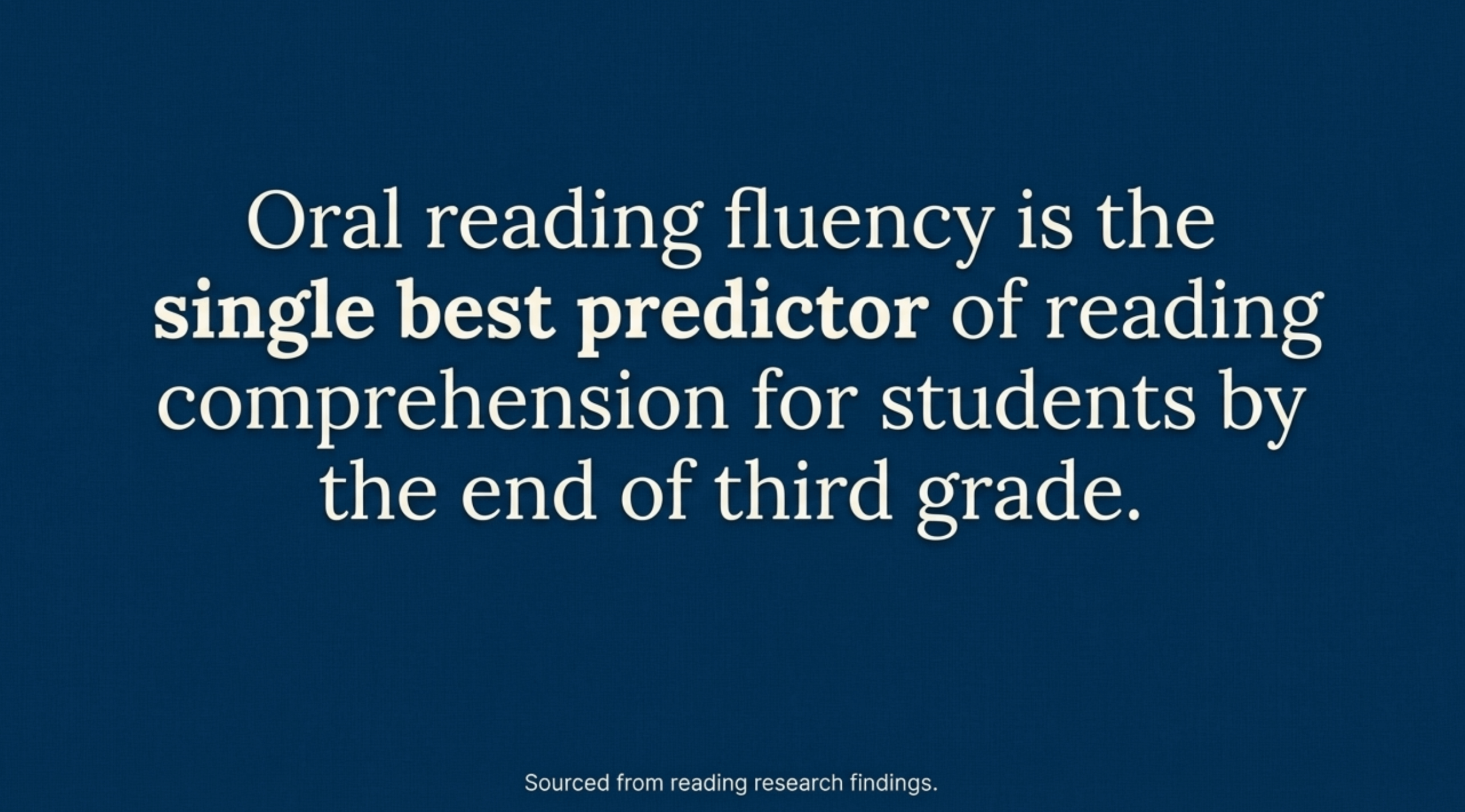 Oral reading fluency is the single best predictor of reading comprehension for students by the end of third grade. Students who read fluently comprehend significantly better than students who decode accurately but slowly.