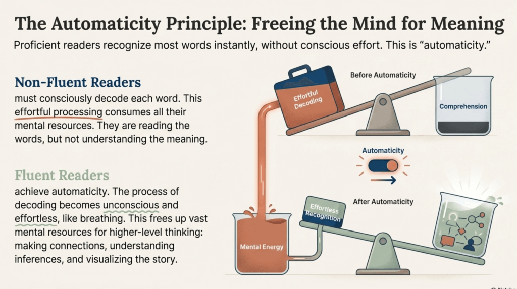 Proficient readers recognize most words automatically—instantly, without conscious effort. This automaticity frees mental resources for higher-level thinking: understanding, analyzing, making inferences, connecting ideas.
