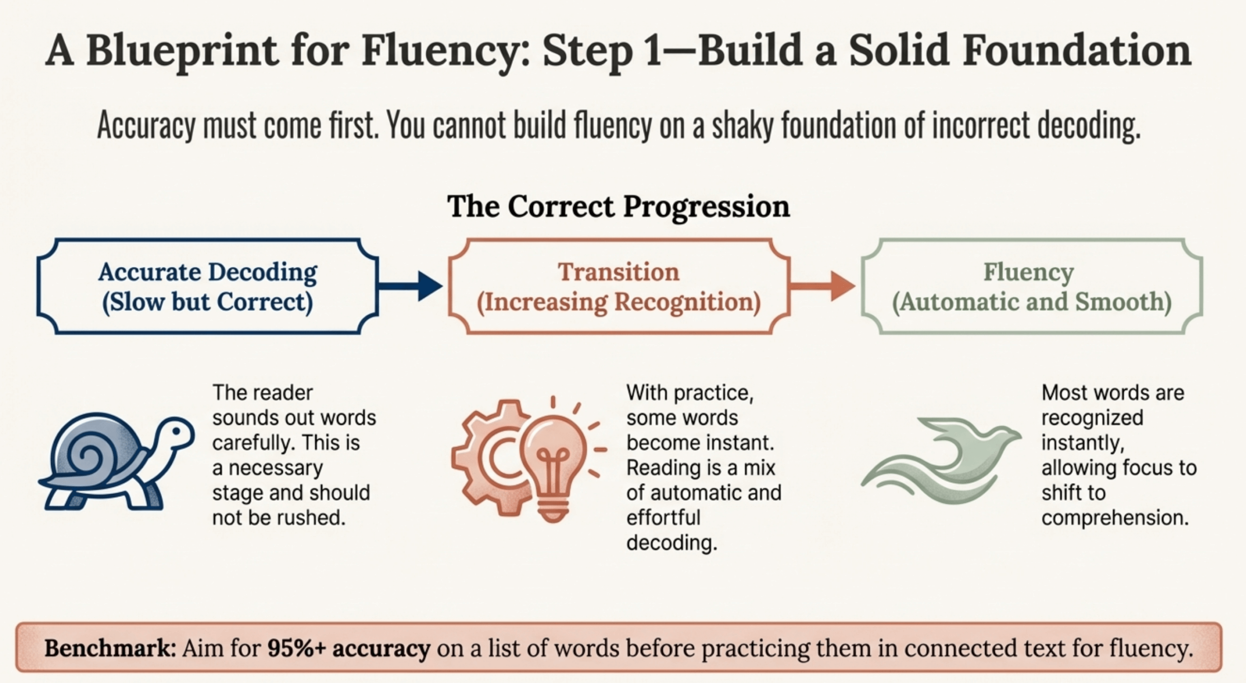 Students cannot become fluent readers until they first achieve accurate decoding. Fluency built on inaccurate reading is false fluency—students reading quickly but incorrectly, often guessing at words rather than decoding them.