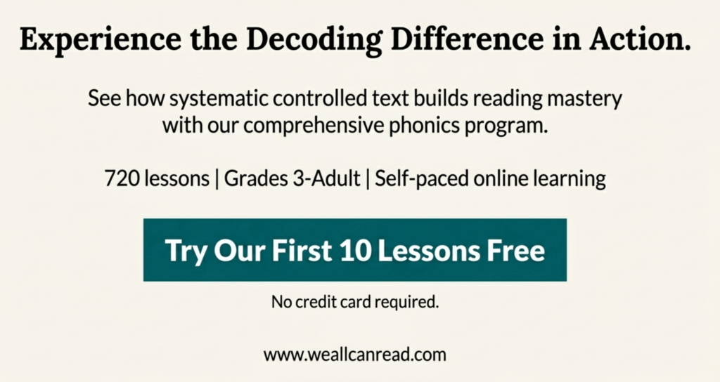 Better approach: Use decodable text matching your child’s current phonics knowledge. Students should recognize 95%+ of words automatically.