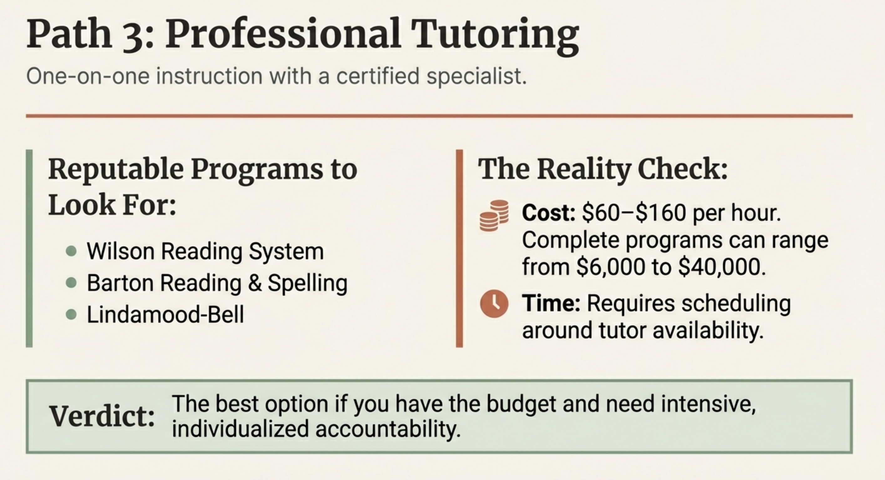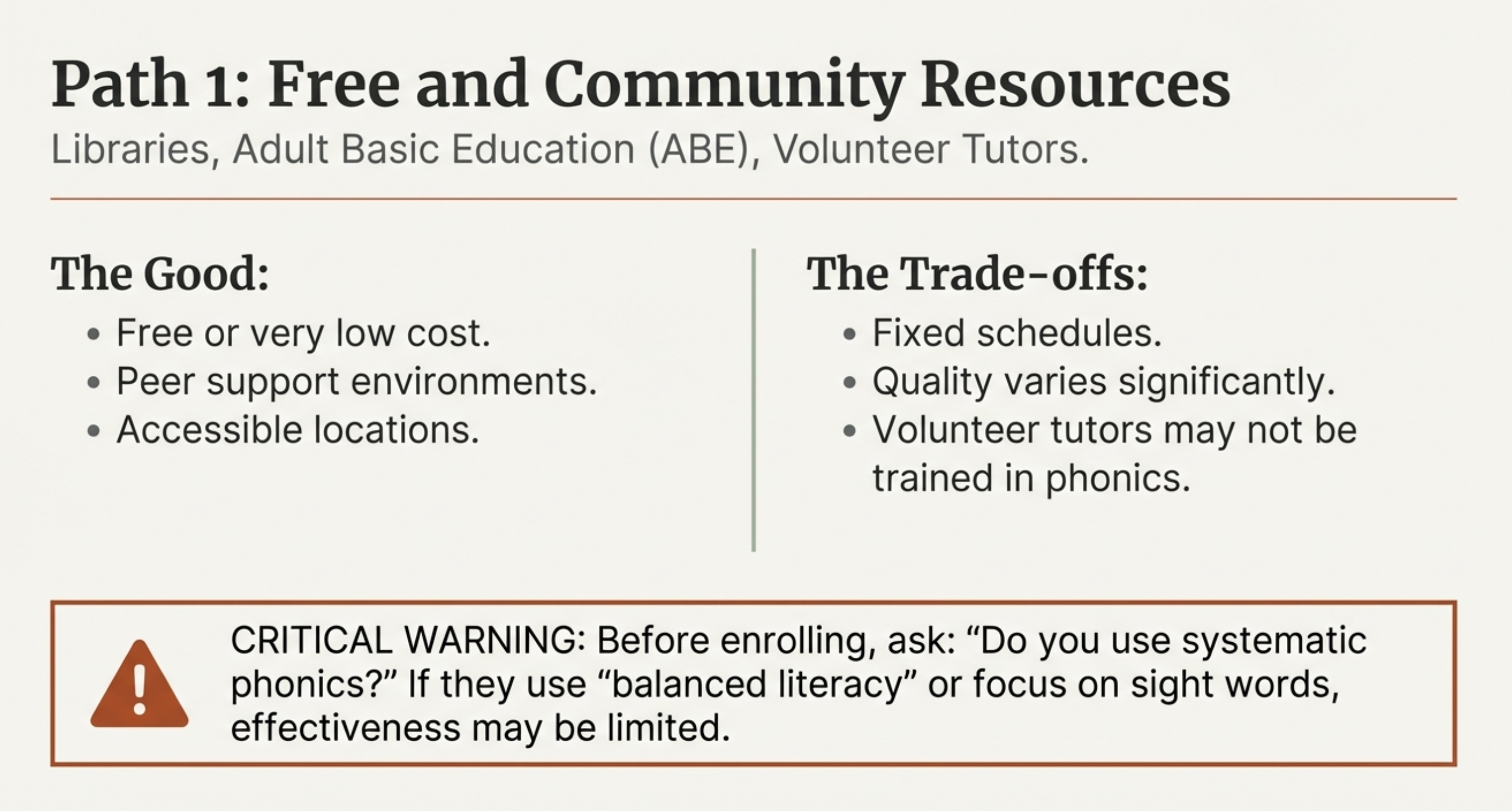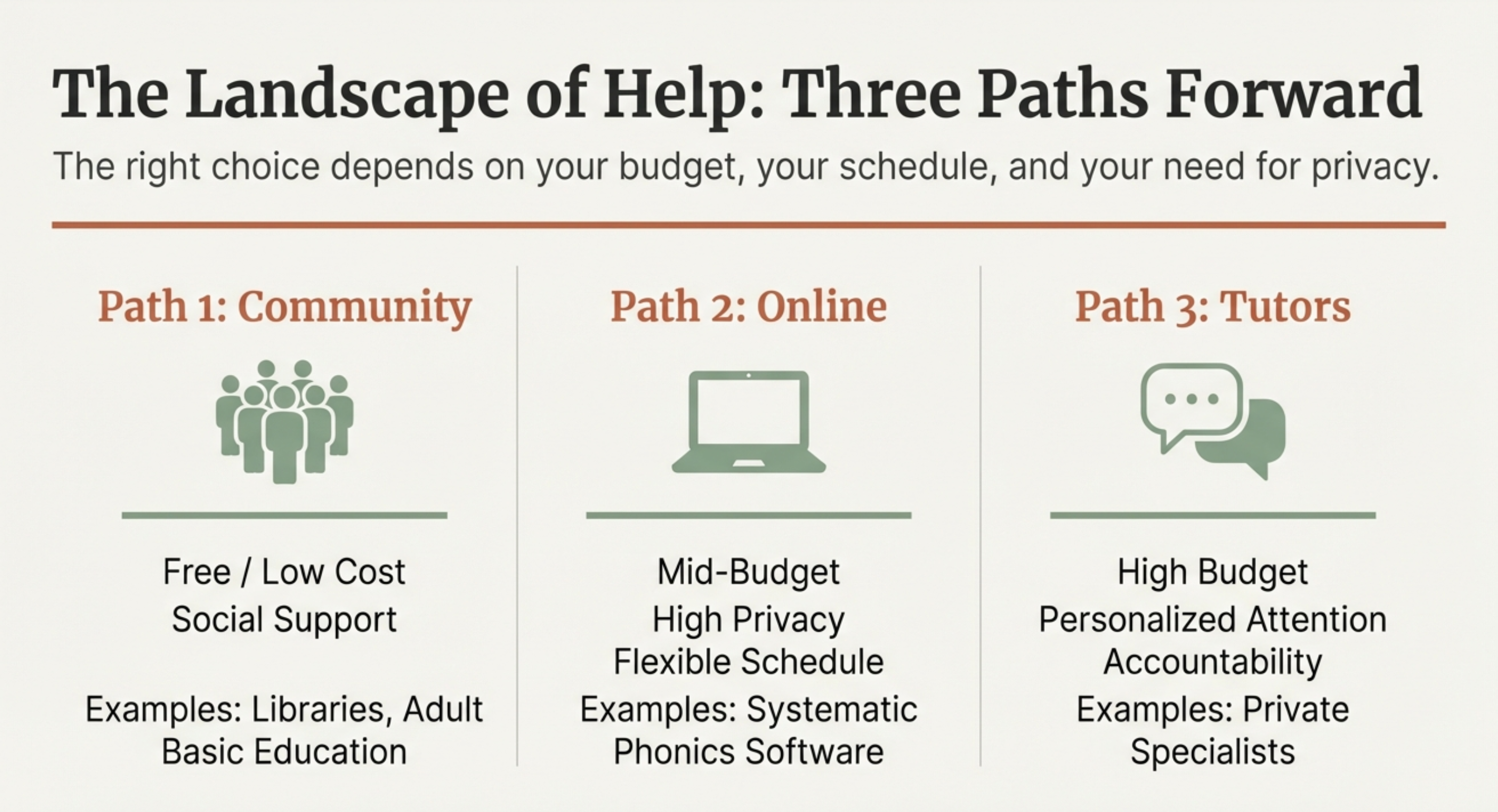 Options exist at every price point. Free adult basic education programs are available in most communities. Online systematic phonics programs typically cost $70-200/month—far less than private tutoring at $60-160/hour. Consider it an investment in your future earning potential, quality of life, and independence.
