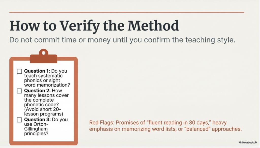 The critical factor is teaching methodology. Programs using systematic phonics consistently achieve better results than those relying on sight word memorization or mixed methods. Beyond methodology, consider format (online vs. in-person), cost, schedule flexibility, and whether content is age-appropriate for adults.