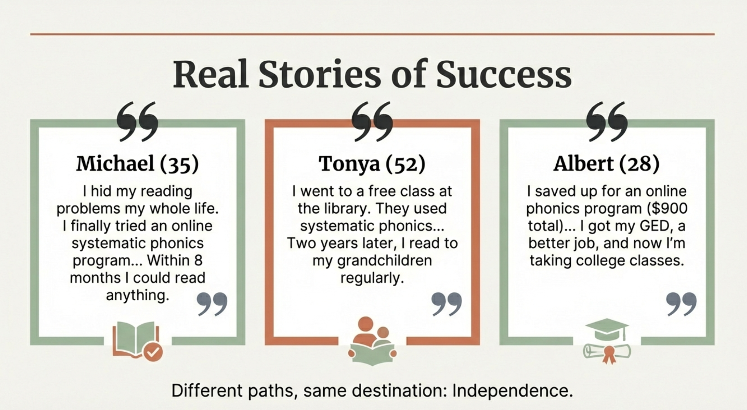 Albert, age 28: “I couldn’t read well enough to fill out job applications. I saved up for an online phonics program. It cost less than $900 total and changed my life. I got my GED, got a better job, and now I’m taking college classes. Reading opened doors I didn’t know existed.”