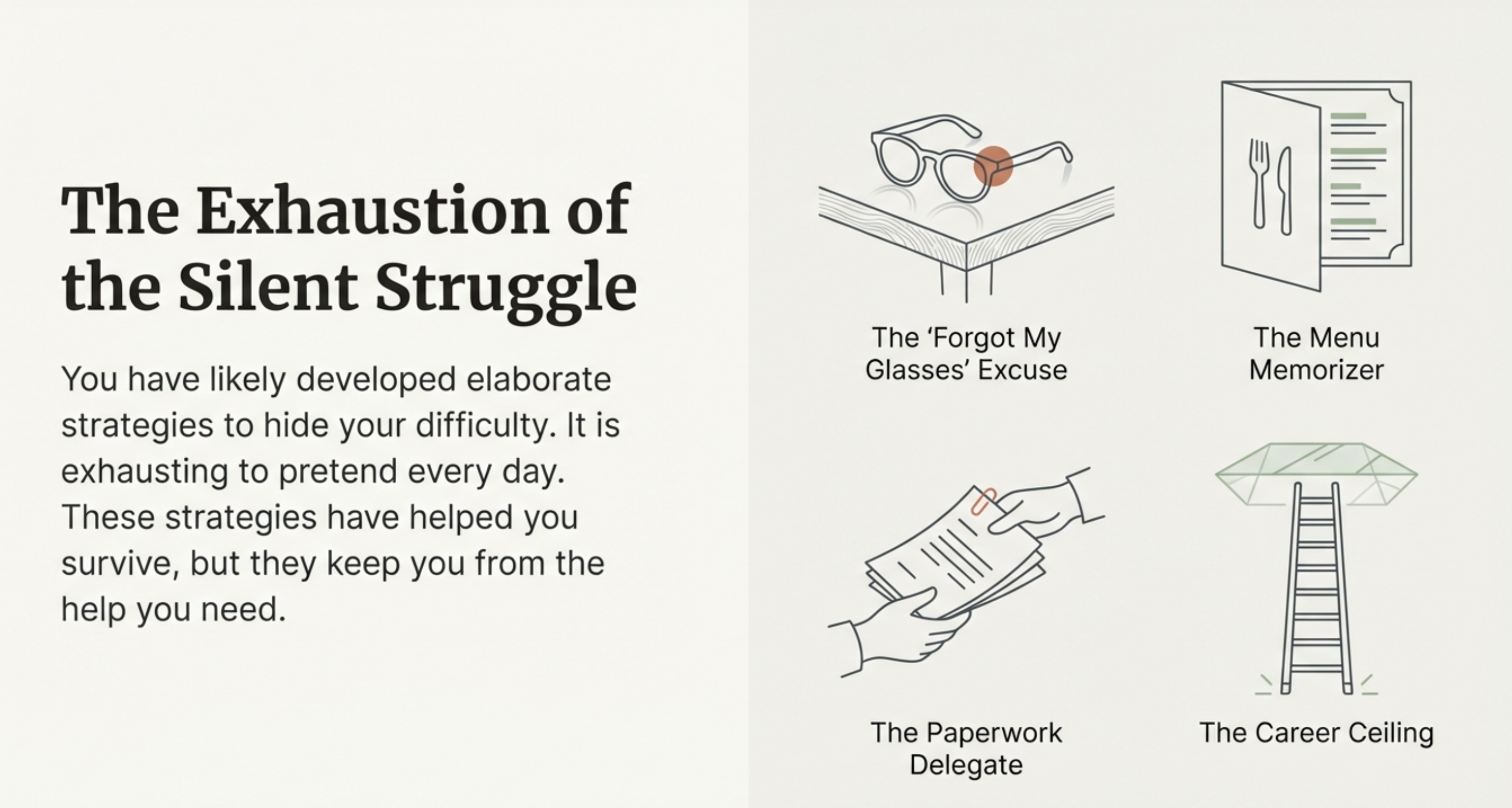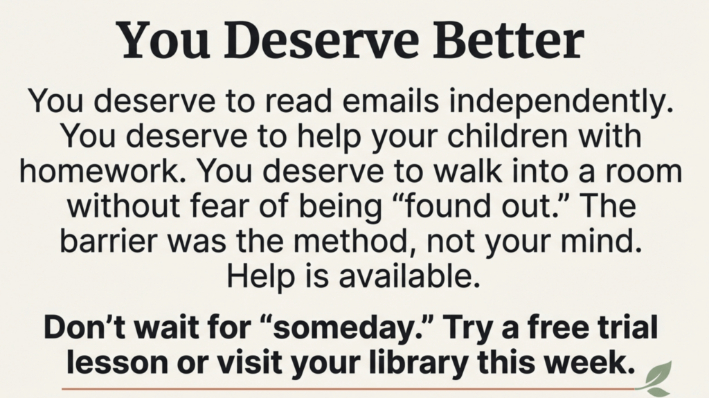 You’ve hidden your reading struggles for years. You’ve developed elaborate strategies to avoid reading aloud. You feel shame when forms need to be filled out. You depend on others for tasks that should be simple. You’re exhausted from pretending.