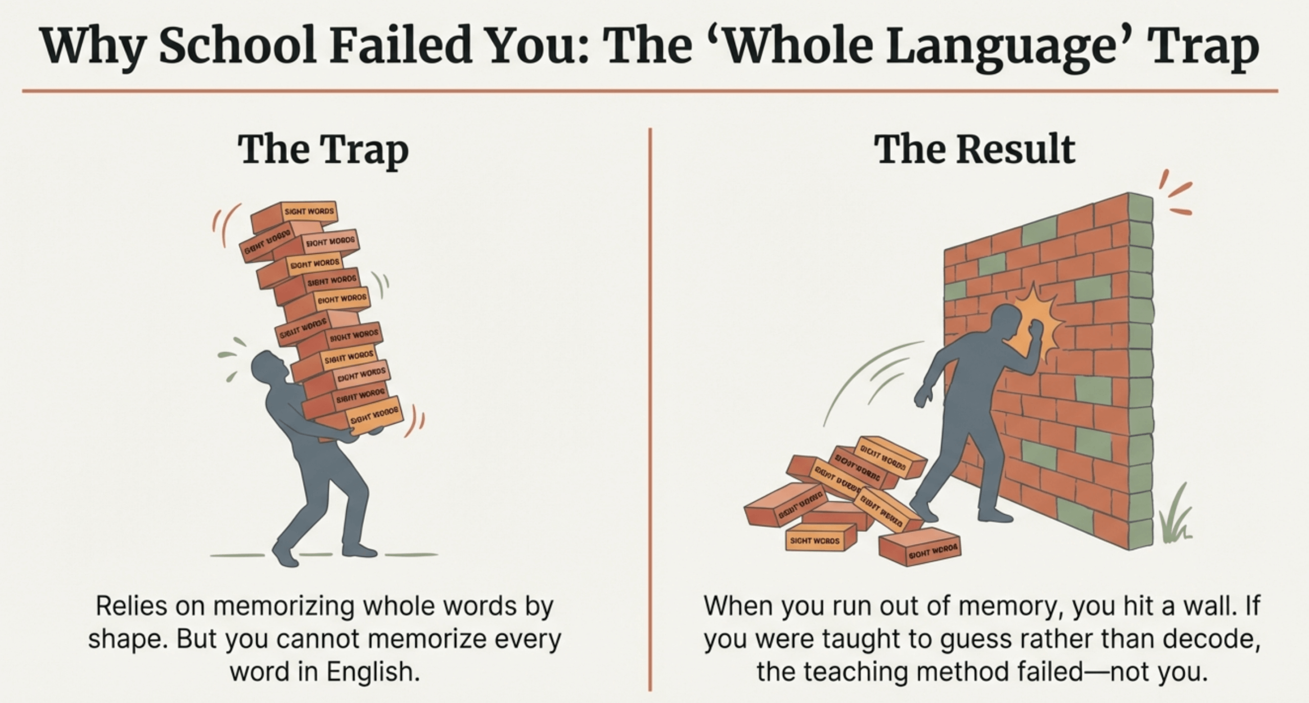 Whole language approaches expected you to memorize whole words by sight or guess words from context and pictures. For some students, this worked. For others—including you—it didn’t.