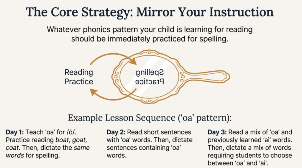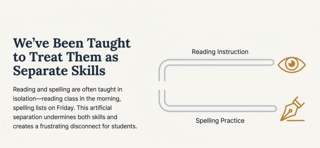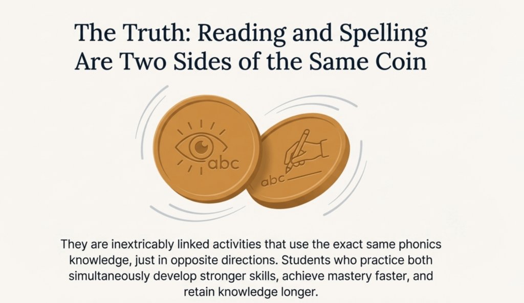 Reading is somewhat passive—students recognize patterns they’ve seen before. Spelling is active—students must consciously generate correct letter sequences from phonics knowledge and memory.