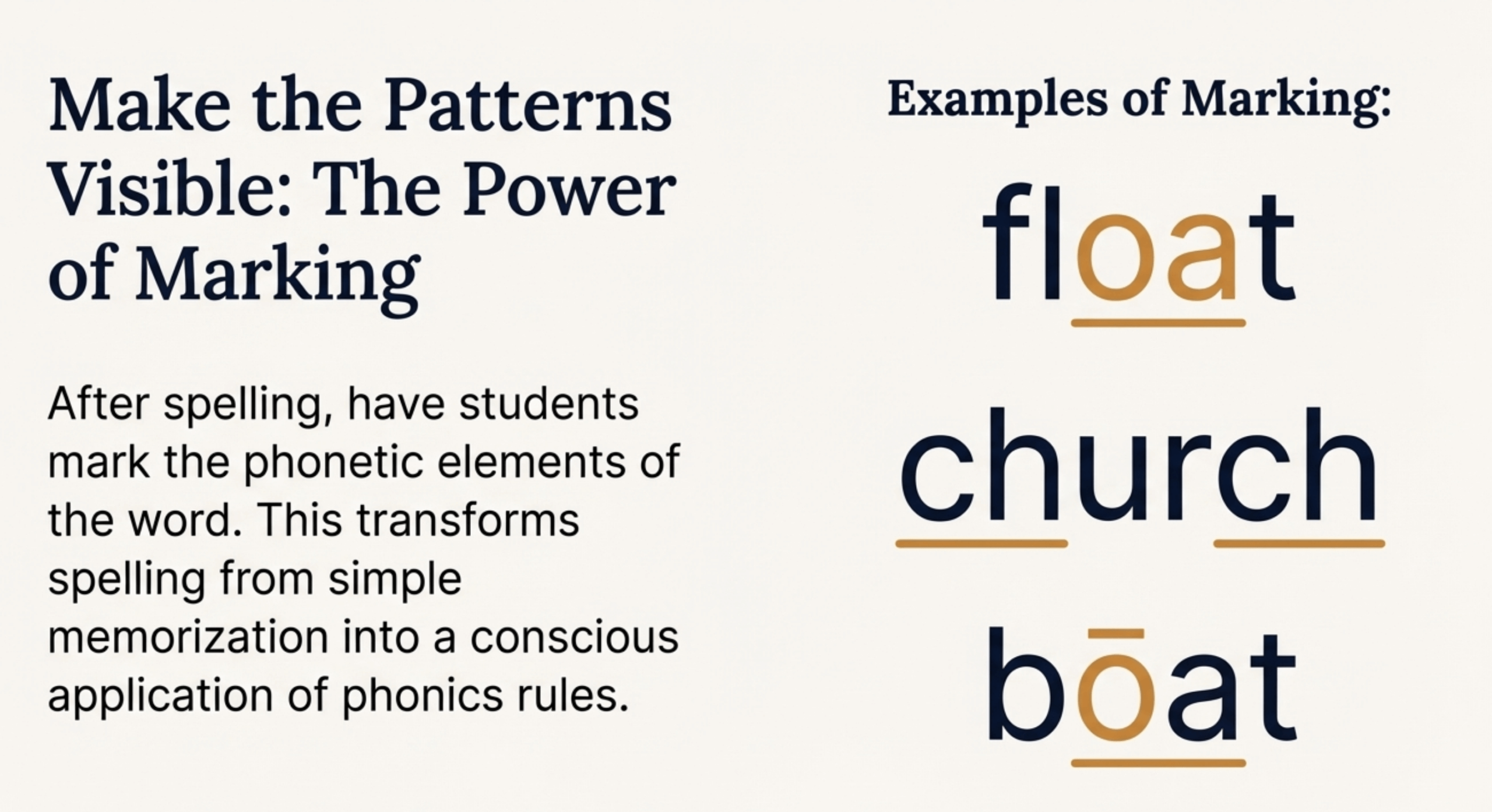 This marking process forces students to analyze the phonetic structure of every word they spell. It transforms spelling from memorization to conscious application of phonics rules.