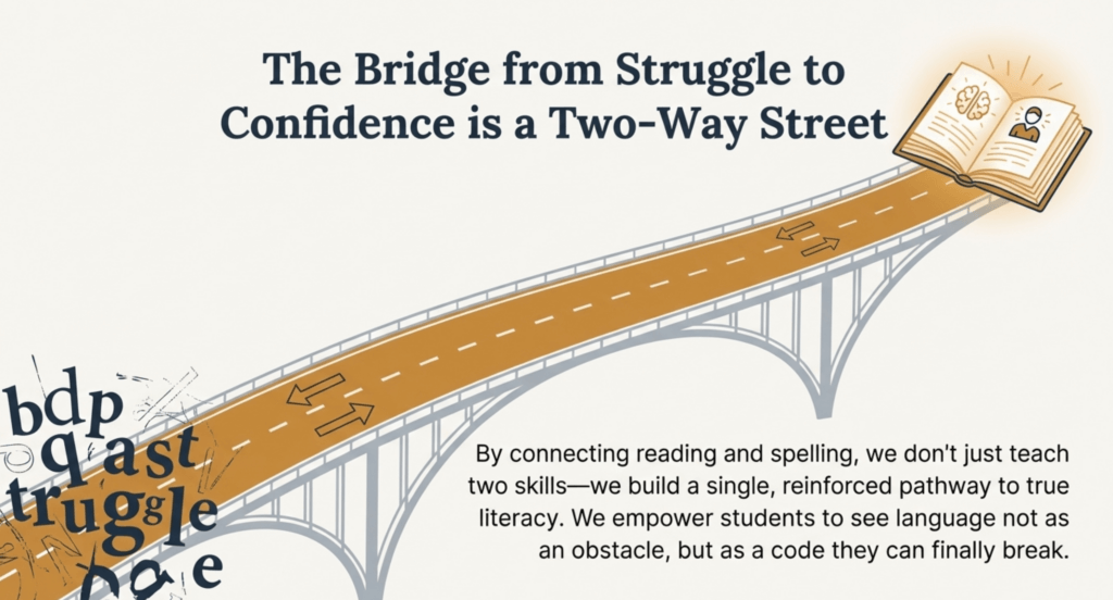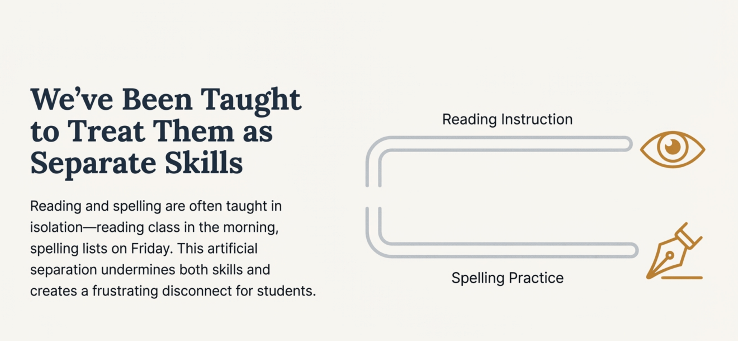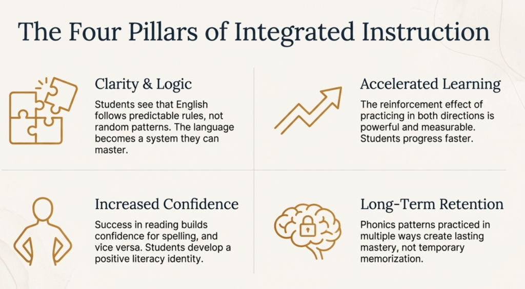 Research consistently shows that students receiving integrated reading and spelling instruction progress faster than students receiving reading instruction alone. The reinforcement effect is powerful and measurable.