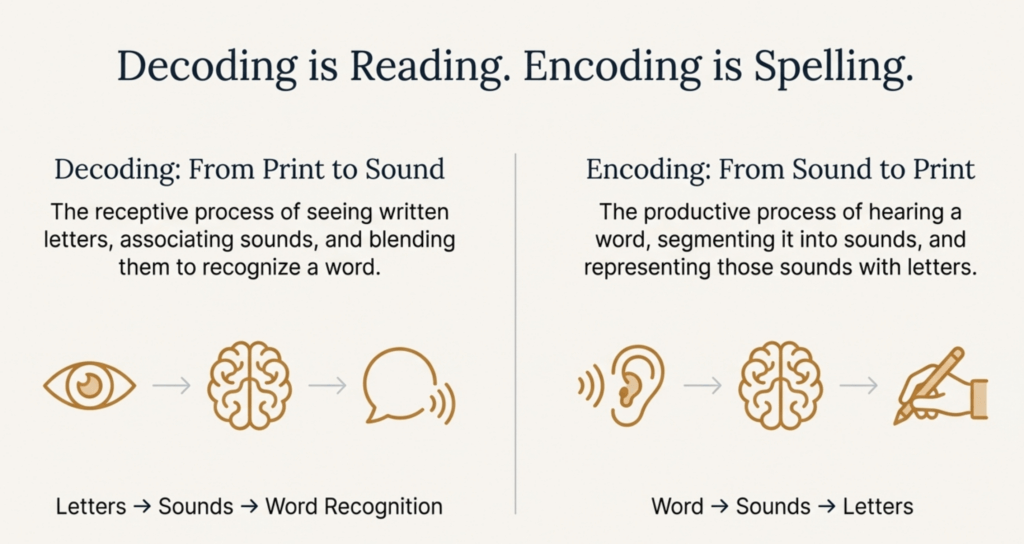 Both decoding and encoding require understanding the relationship between letters and sounds. The difference is the direction: