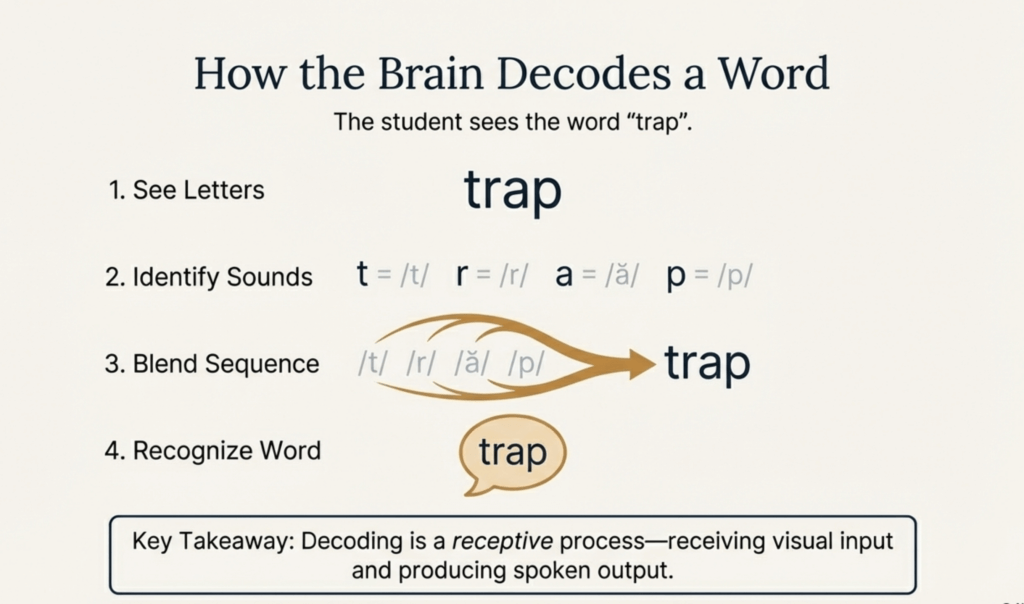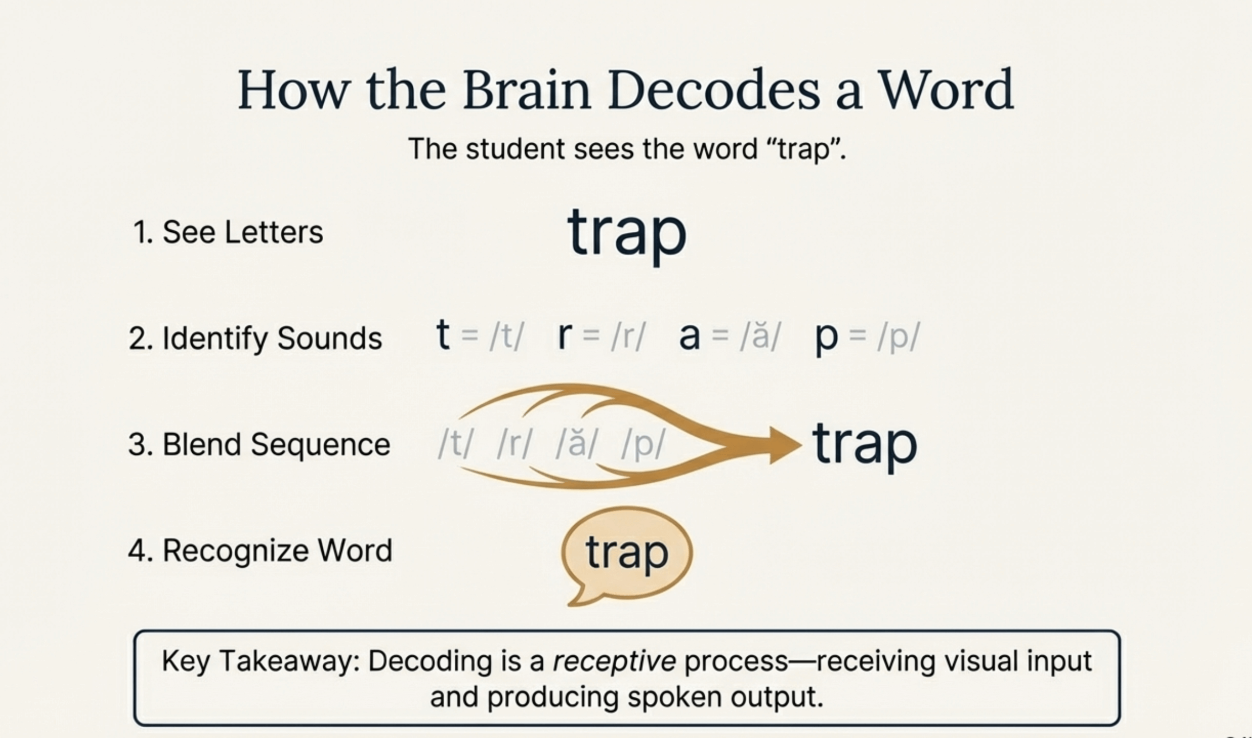 Decoding is a receptive process—students receive visual input (letters) and produce spoken output (word pronunciation).