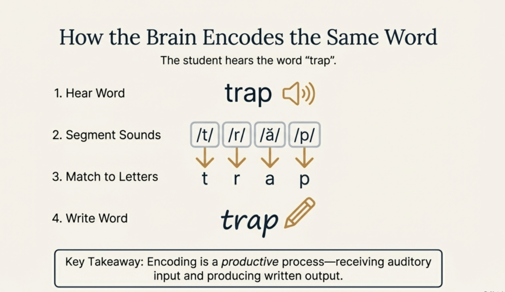 Encoding is a productive process—students receive auditory input (word pronunciation) and produce written output (letters).