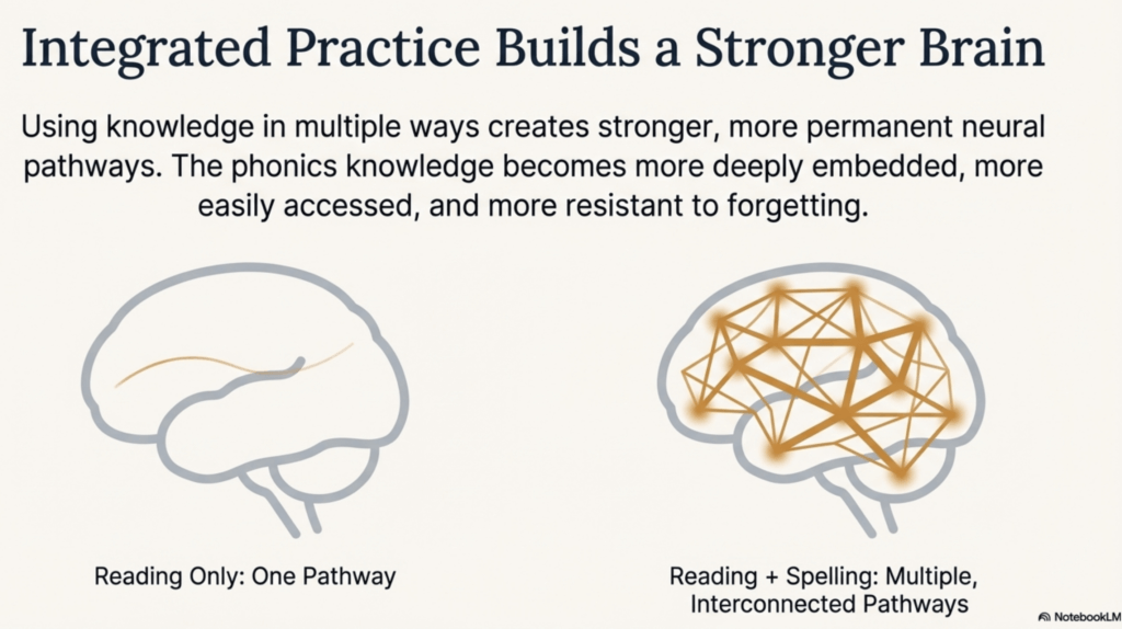 Brain research shows that using knowledge in multiple ways creates stronger, more permanent learning. When students practice a phonics pattern only through reading, they build one neural pathway. When they practice the same pattern through both reading and spelling, they build multiple interconnected pathways.