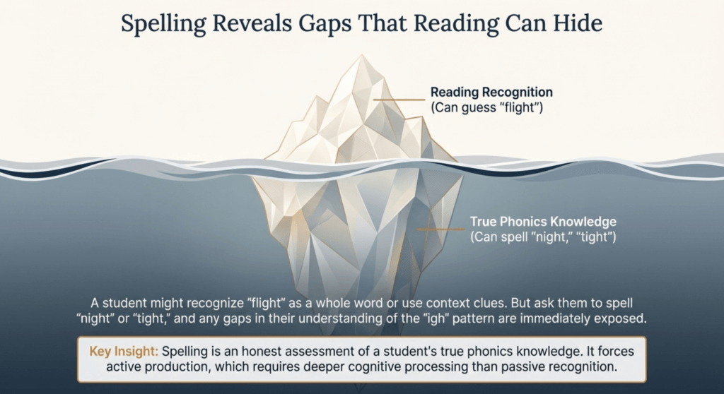But spelling exposes incomplete knowledge. When asked to spell “night” or “tight,” a student who doesn’t truly understand the “igh” pattern will struggle. Spelling reveals gaps that reading alone might hide.