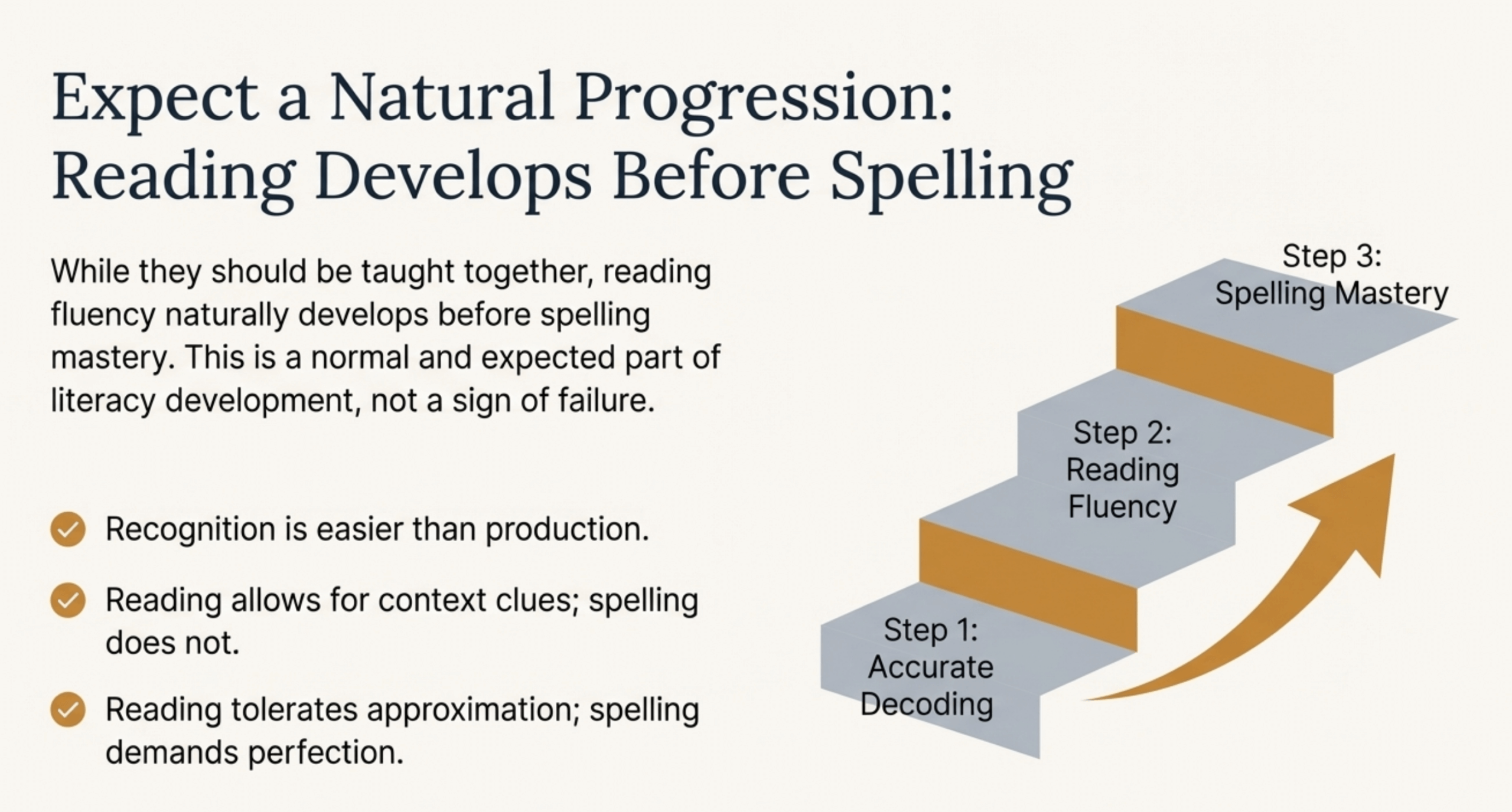 While reading and spelling should be taught together, reading fluency naturally develops before spelling mastery. This isn’t a problem—it’s a normal part of literacy development.