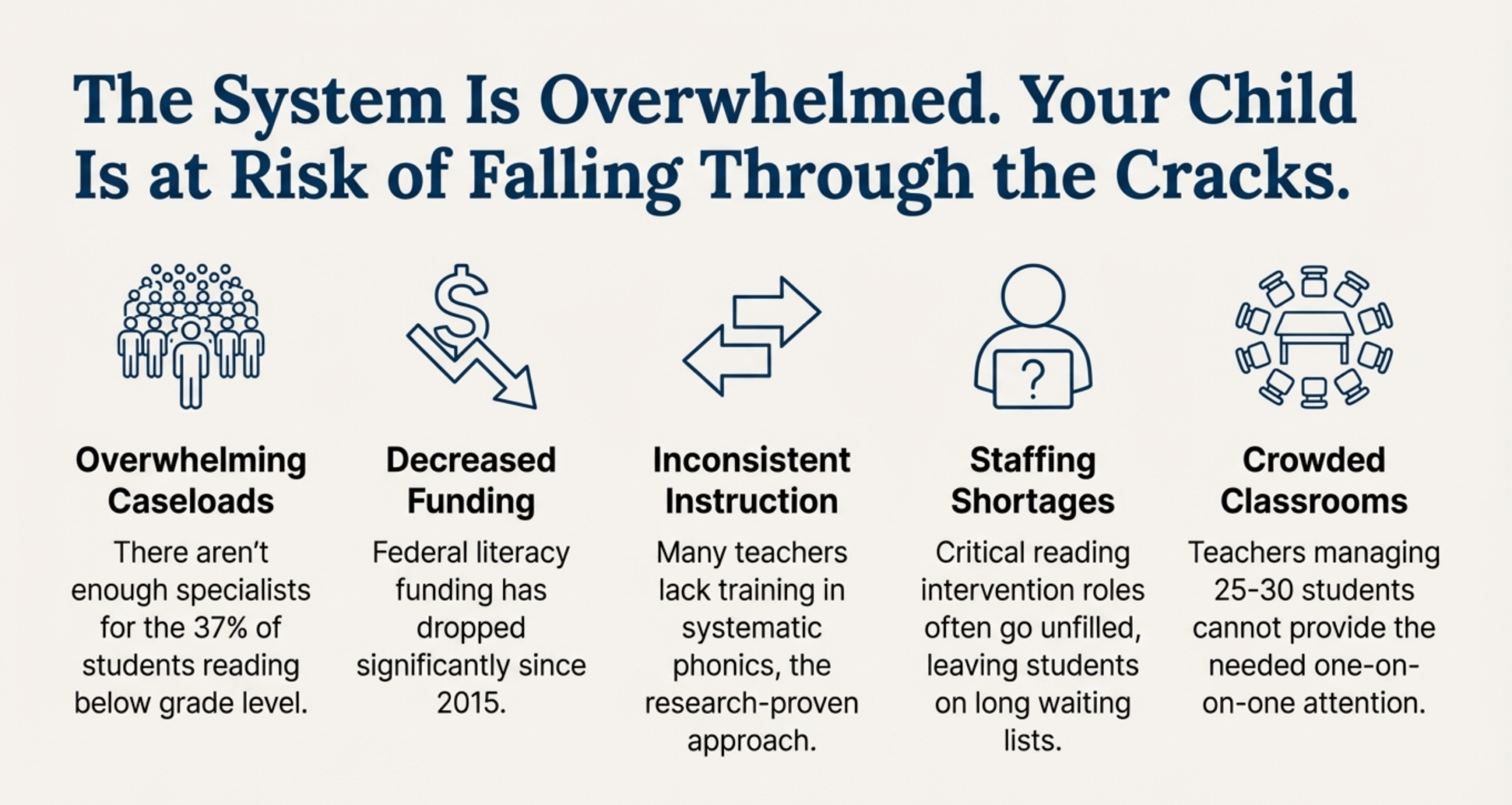 The reality: Schools want to help but lack the resources, staff, and capacity to address the magnitude of this crisis. If your child is struggling with reading, waiting for school intervention may mean waiting months or years—time your child cannot afford to lose.