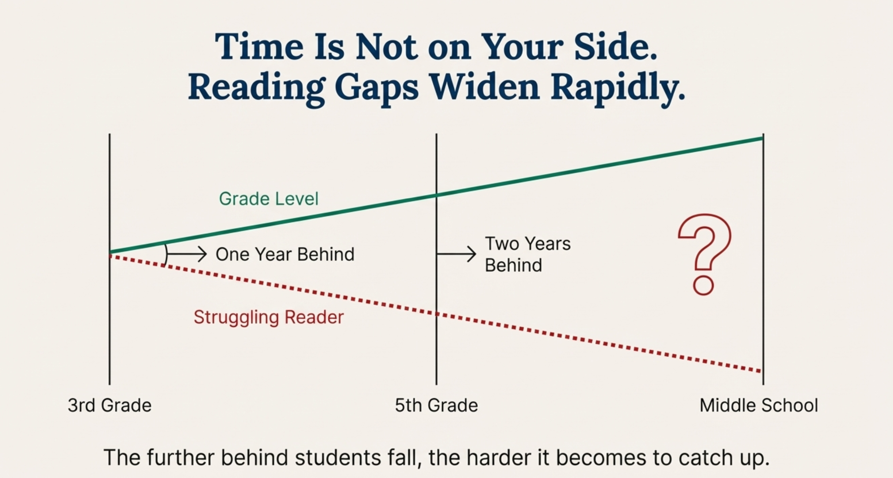 Reading gaps widen rapidly. A child one year behind in third grade will be two years behind by fifth grade without intervention. The further behind students fall, the harder it becomes to catch up. Early action prevents struggling readers from becoming non-readers.