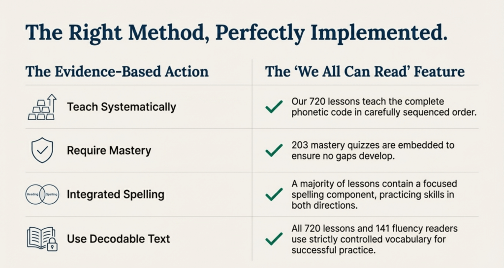 Our comprehensive phonics program was designed specifically to help struggling readers by systematically implementing every evidence-based strategy outlined above: