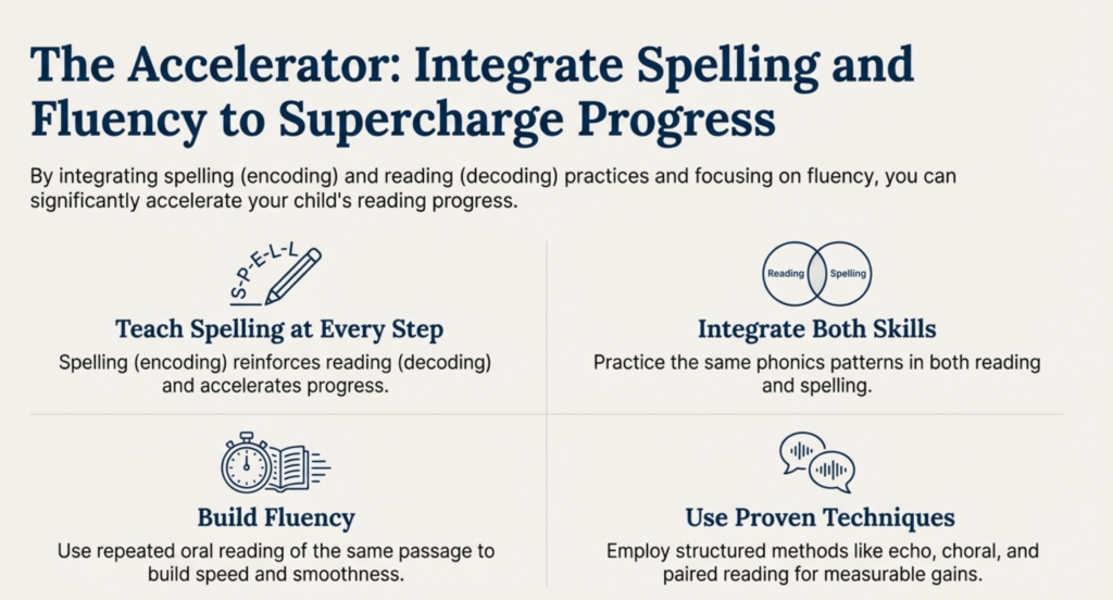 Spelling (encoding) reinforces reading (decoding). When your child spells words, they actively apply phonics knowledge rather than relying upon memory to spell words. Spelling practice dramatically accelerates reading progress.
