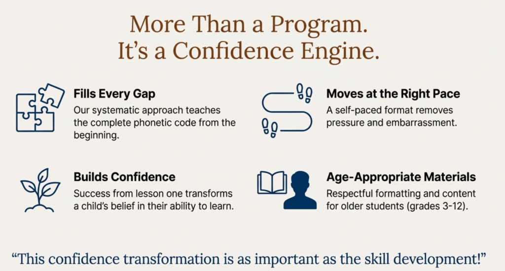 The good news: parents don’t need specialized training to help struggling readers—they need the right systematic program and commitment to consistent practice.
