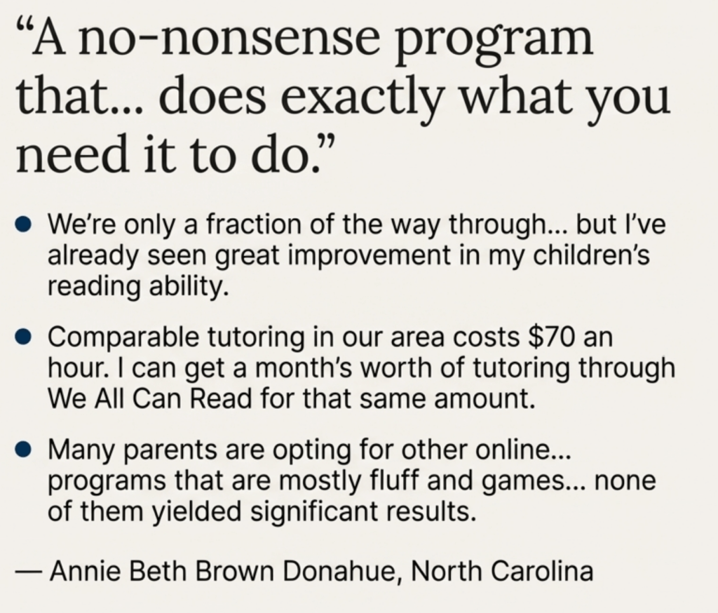 Many parents are opting for other online, subscription-based reading programs that are mostly fluff and games. Despite the great reviews and the fun graphics, none of them yielded significant results, even with daily use. In contrast, We All Can Read is a no-nonsense program that starts from the ground up, eliminates learning gaps, and does exactly what you need it to do.”