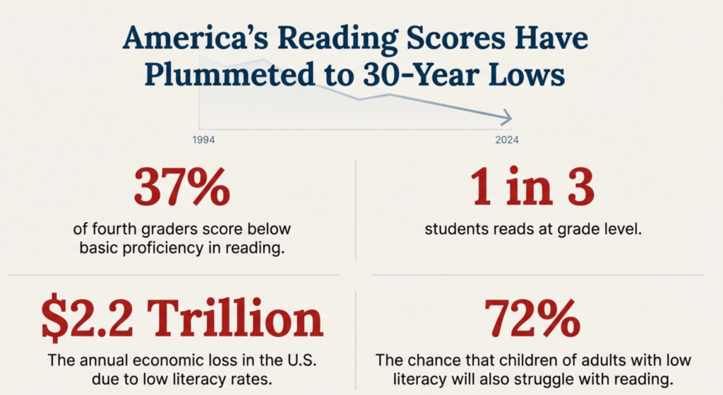 The scale of this crisis is staggering: 28 percent of U.S. adults now read below a third-grade level, a 9 percent increase since 2017. Only one in three students reads at grade level. Approximately 37 percent of fourth graders and 31 percent of eighth graders score below basic proficiency in reading.