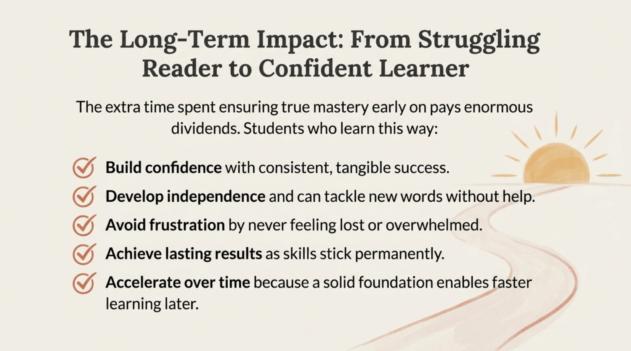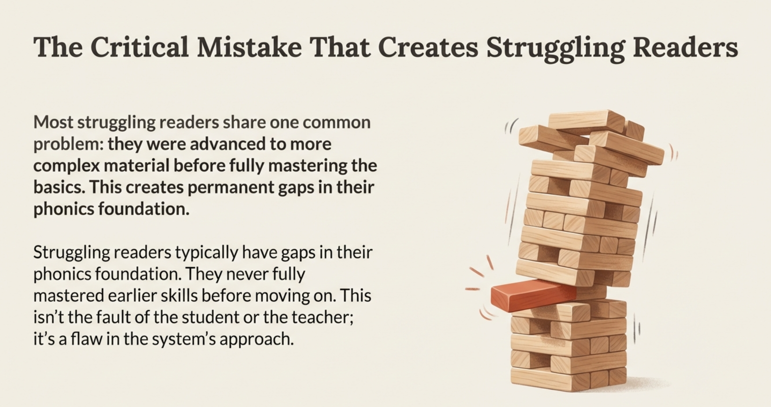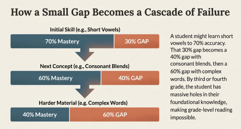 Struggling readers typically have one thing in common: gaps in their phonics foundation. They never fully mastered earlier skills before moving to more complex material. A student might have learned short vowels to 70% accuracy, then moved on to consonant blends before achieving true mastery. That 30% gap becomes a 40% gap, then a 60% gap as material gets harder.