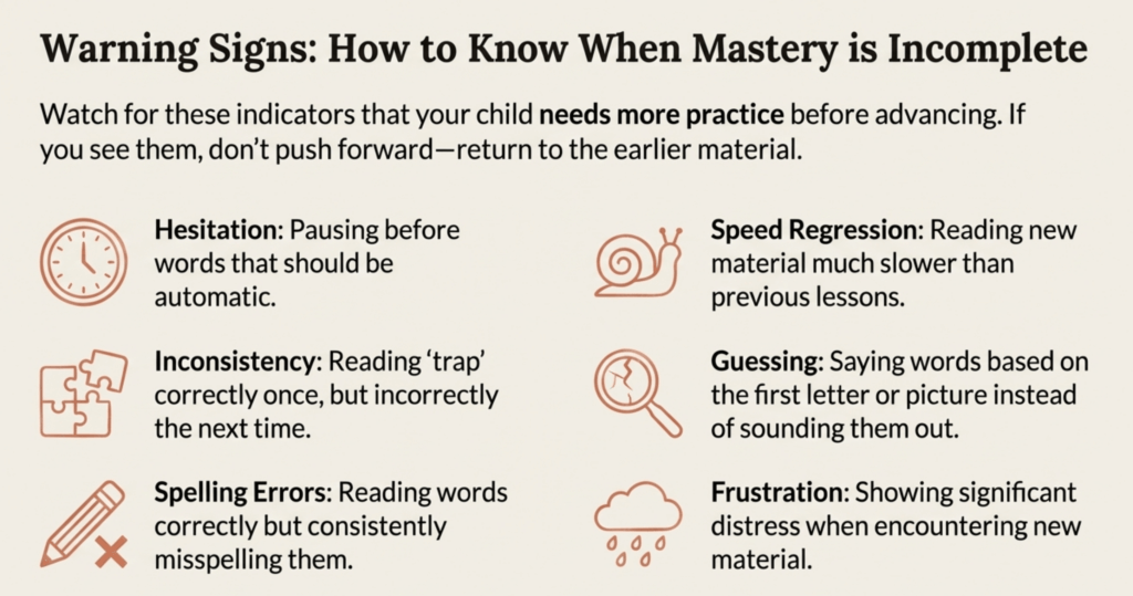 This requires patience and discipline. If your child reads 15 out of 20 words correctly, they’re not ready to advance—even if it’s been three days on the same lesson. Keep practicing until they achieve 80%+ accuracy consistently.