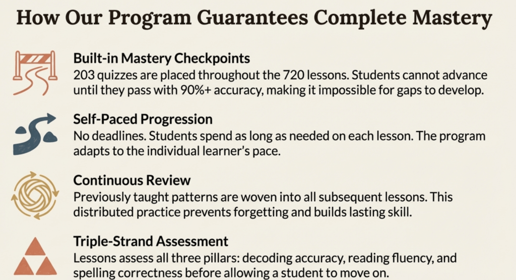 Our 720-lesson program includes 203 quizzes strategically placed throughout the curriculum. Students cannot advance to the next lesson until they pass the quiz with 90%+ accuracy, ensuring no gaps develop.