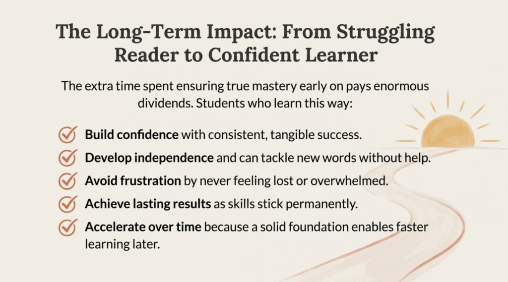 Without this intensive, systematic practice, struggling readers develop the illusion of understanding—they might pass Friday’s test but can’t apply skills the following week.
