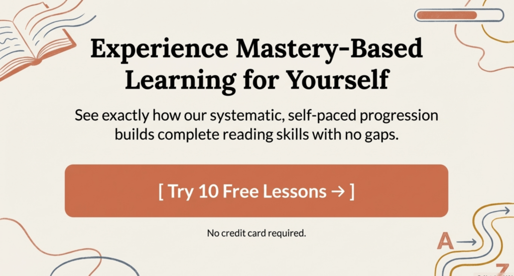 See how mastery-based progression builds complete reading skills with no gaps. Try our first 10 lessons free—no credit card required.
