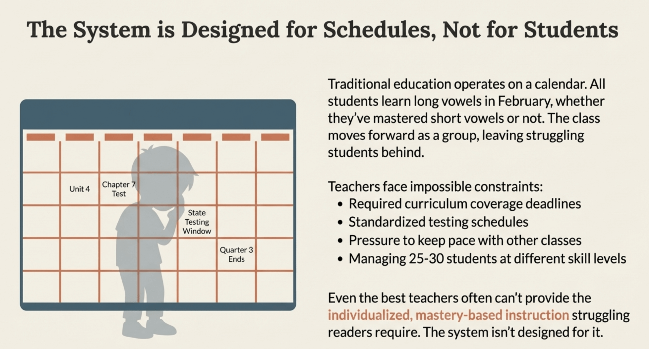 Even well-meaning teachers can’t provide the individualized, mastery-based instruction struggling readers require. The system isn’t designed for it.