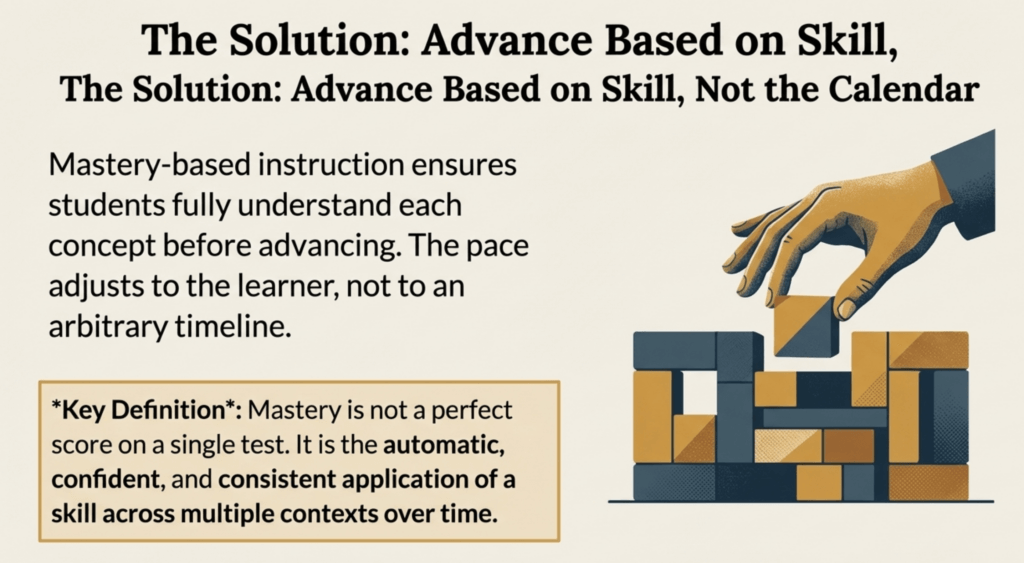 Mastery-based instruction prevents this catastrophic cascade of gaps by ensuring students fully understand each concept before advancing.