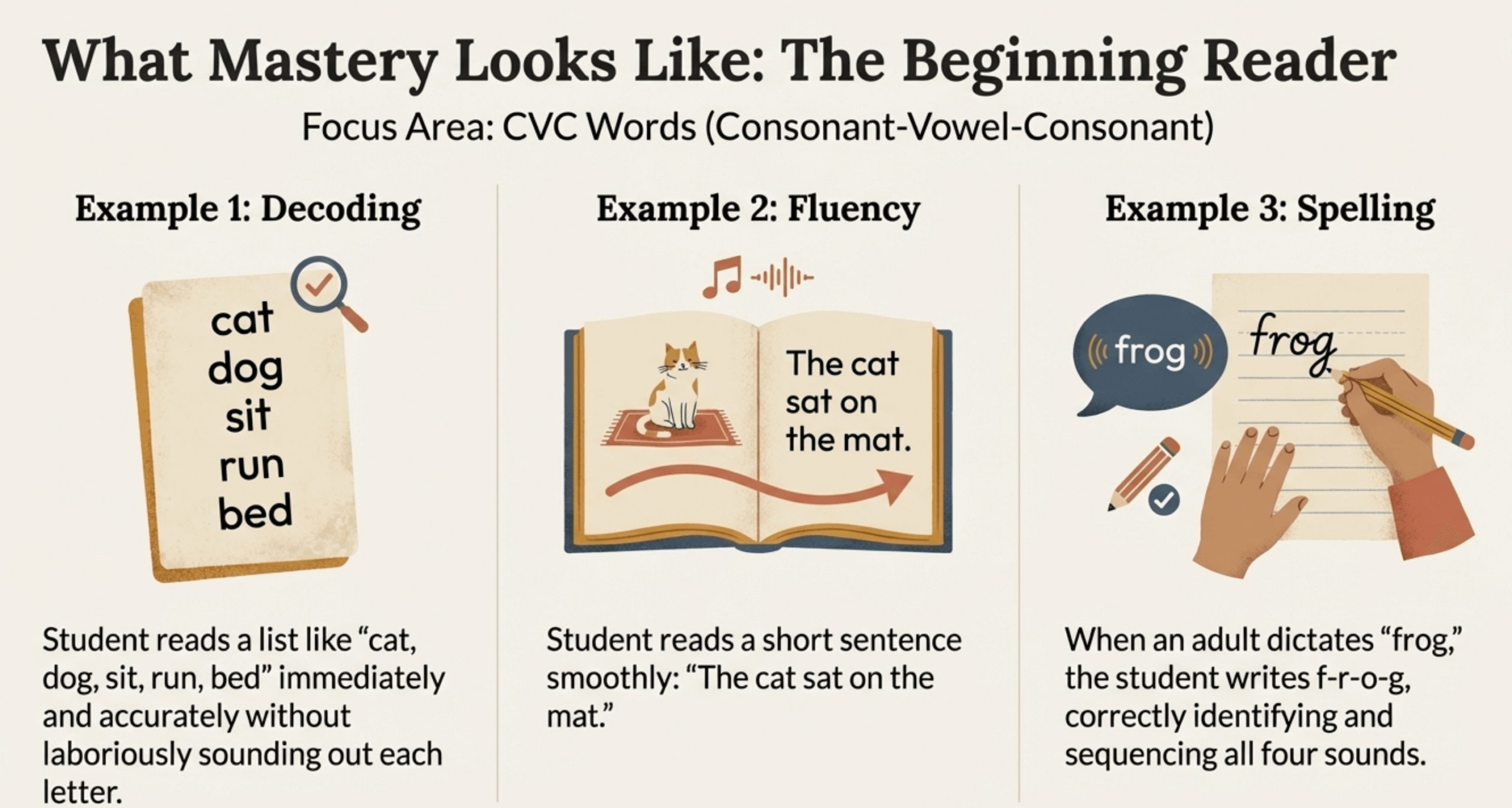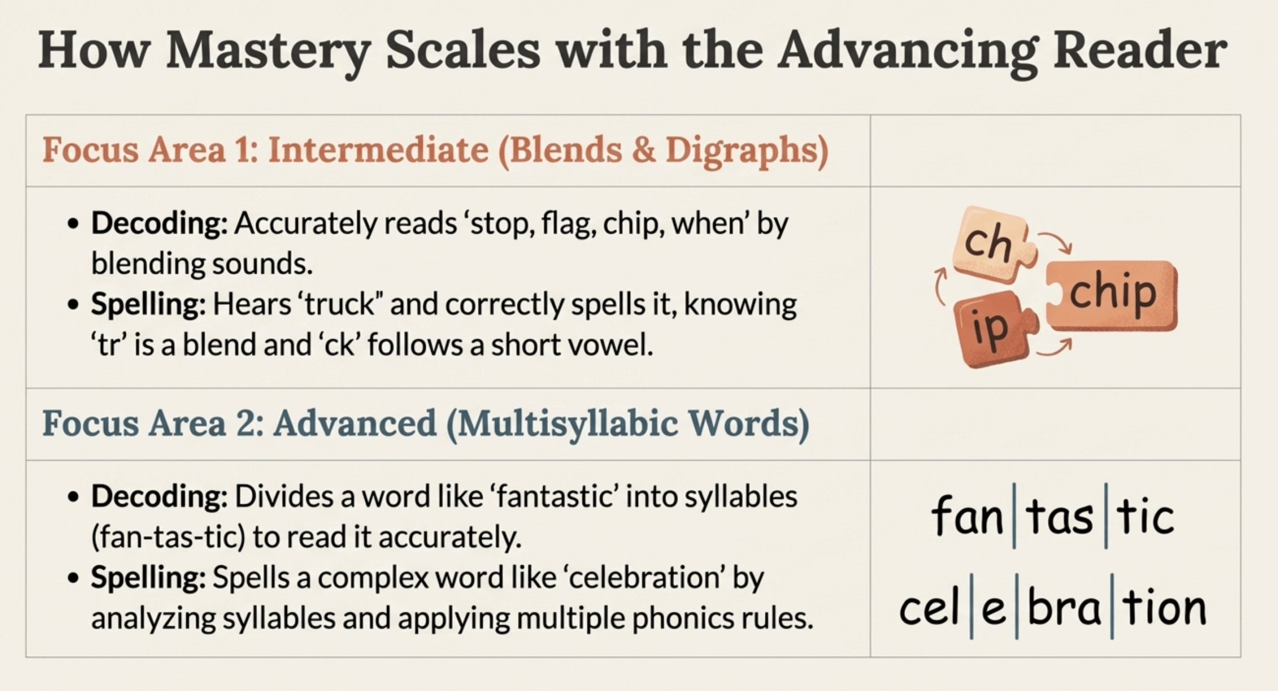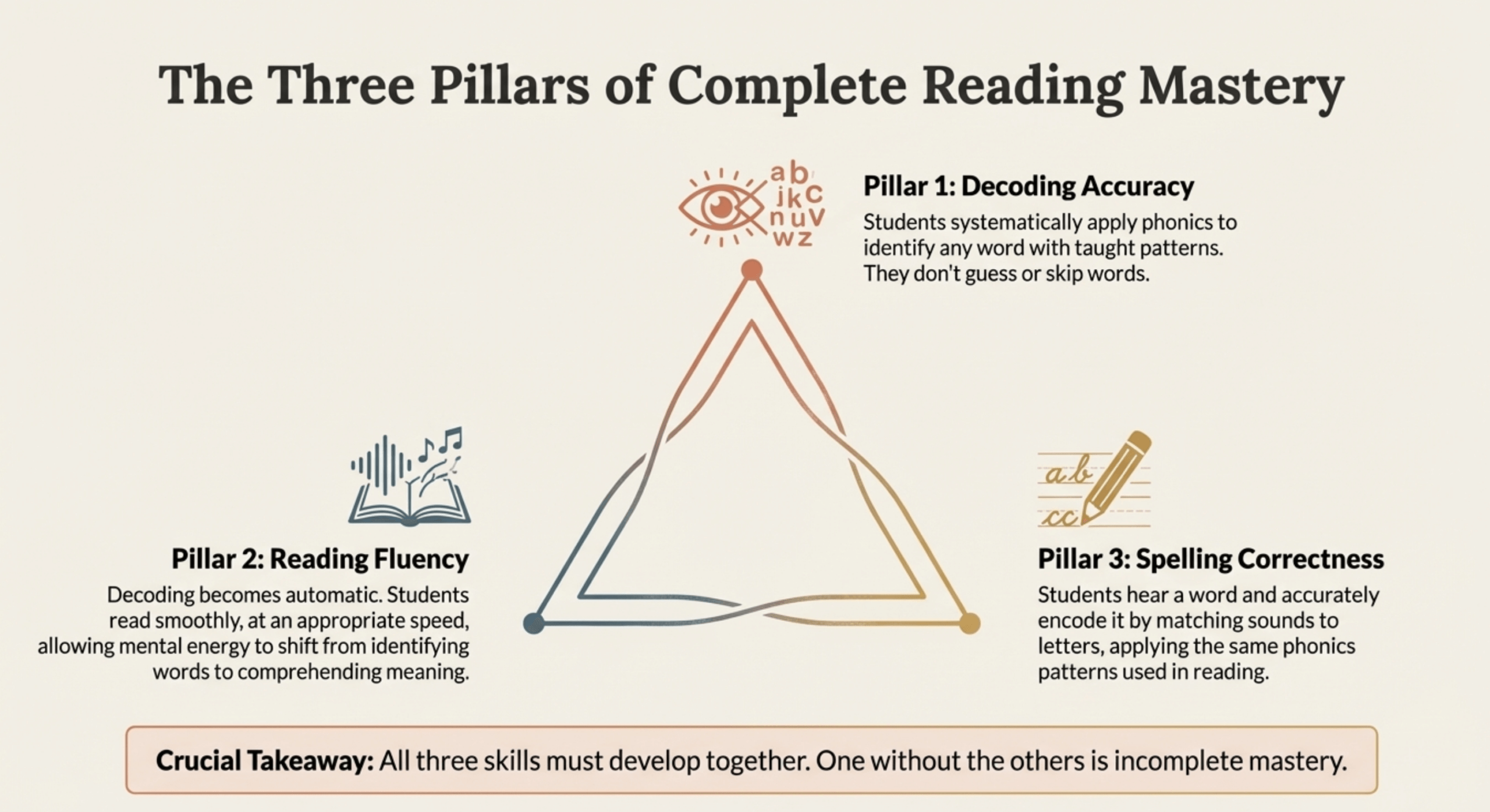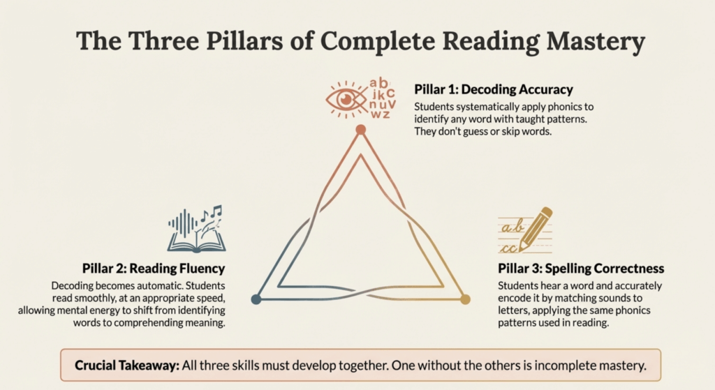 All three skills must develop together. A student who reads accurately but can’t spell hasn’t mastered the phonics pattern. A student who spells correctly but reads slowly and laboriously hasn’t achieved fluency. Complete mastery requires all three.