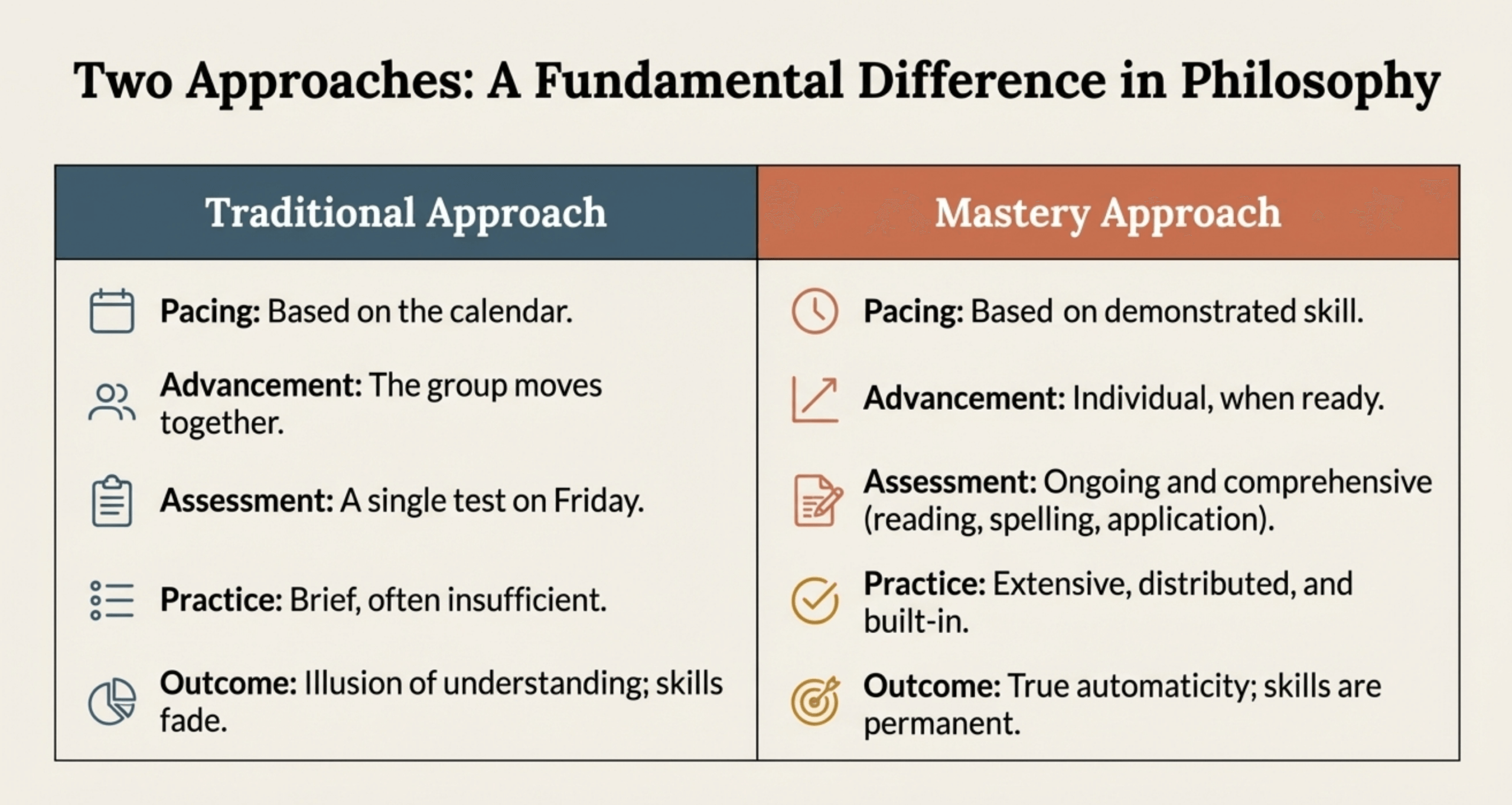 Traditional education operates on a calendar-based progression. All students learn long vowels in February whether they’ve mastered short vowels or not. The class moves forward as a group, leaving struggling students behind.