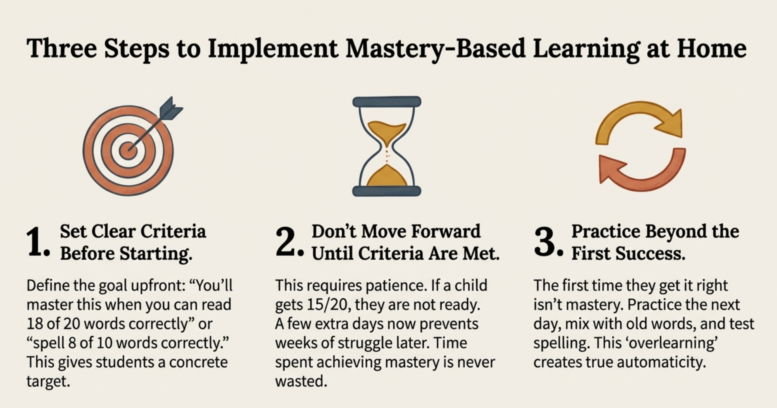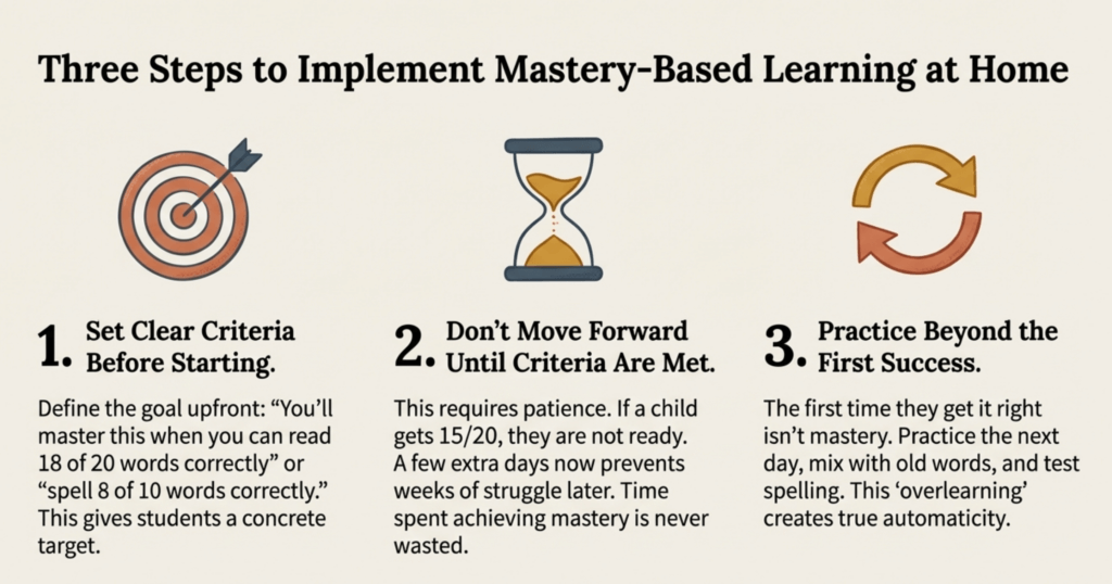 Mastery doesn’t mean perfect performance on a single test. It means automatic, confident, consistent application of a skill across multiple contexts over time.